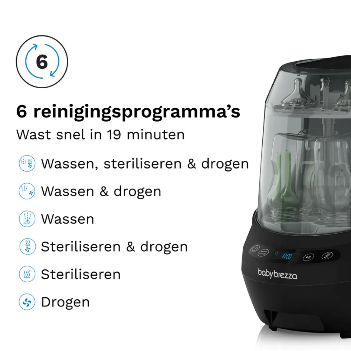 Met ruimte voor vier flessen, kolfonderdelen en accessoires, biedt de Baby Brezza Bottle Washer Pro een grote capaciteit die geschikt is voor vrijwel alle flessen en de meeste kolfonderdelen en drinkbekers. De machine biedt zes reinigingsstanden, waaronder combinaties van wassen, steriliseren en drogen, waardoor je de reinigingscyclus kunt aanpassen aan jouw specifieke behoeften. Dit apparaat is niet alleen veelzijdig maar ook milieuvriendelijk, aangezien het 50% minder water gebruikt dan handmatig wassen.