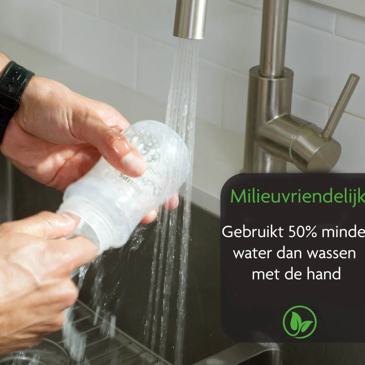 De Baby Brezza Bottle Washer Pro is ontworpen met gemak in gedachten. Er is geen wateraansluiting nodig dankzij de handige verwijderbare schoon- en vuilwaterreservoirs. Het apparaat is BPA-vrij en wordt geleverd met een garantie van 24 maanden. Om watervlekken te voorkomen, kantel je de producten in de machine om restwater weg te laten lopen. Als je in een gebied met hard water woont, gebruik dan een waterontharder of gedestilleerd water om kalkaanslag te vermijden.