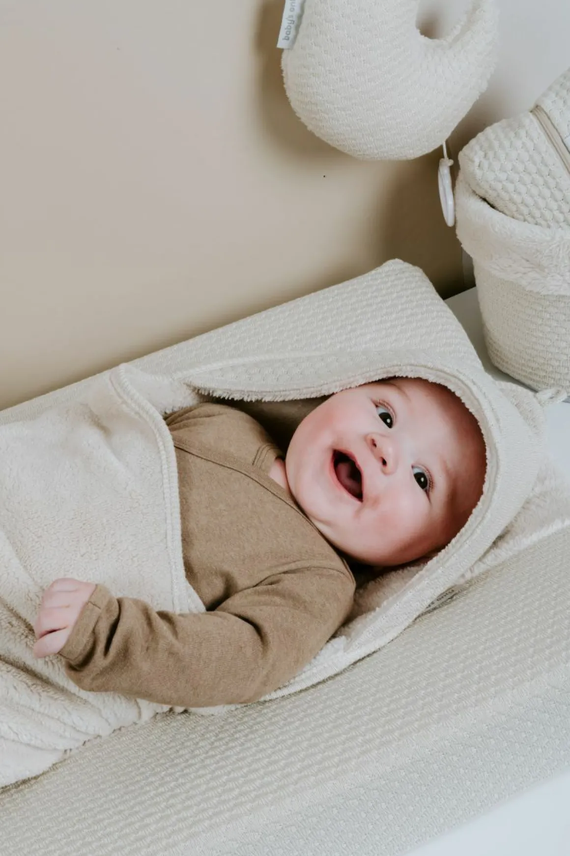 De Sky Warm Linen omslagdoek van Baby’s Only is voorzien van een capuchon en een handig lusje zodat jij de doek gemakkelijk op kunt hangen. Gebruik de doek bijvoorbeeld na het badderen, tijdens het voeden of voor onderweg. Door de openingen in de doek, kun je de omslagdoek ook gebruiken voor in de autostoel omdat de gordels er doorheen kunnen, ideaal!
