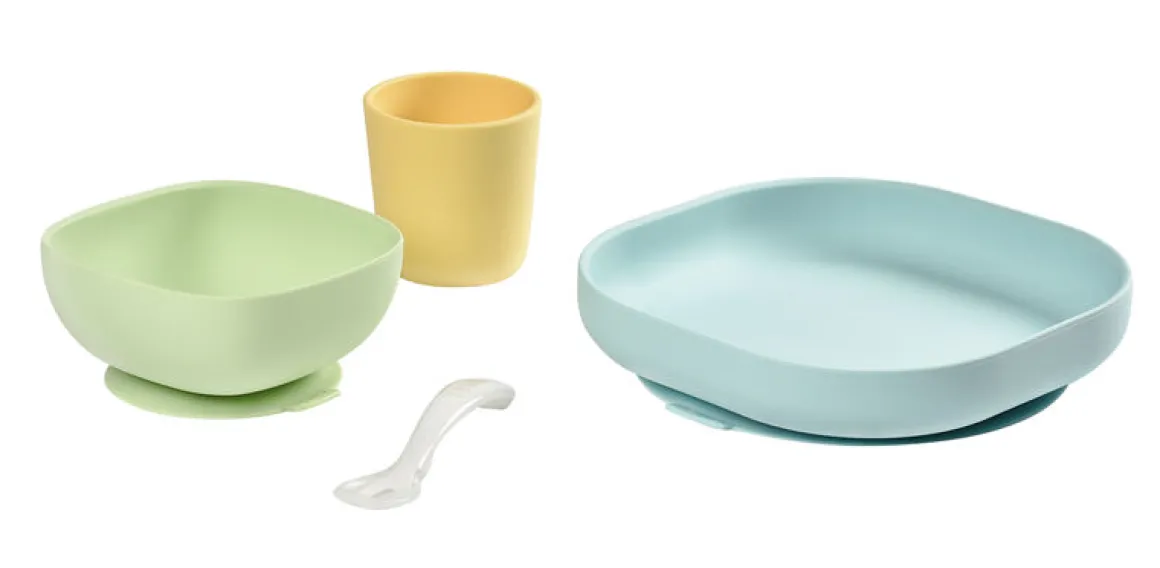 De Beaba Siliconen Eetset 4 stuks wordt geleverd met een bord, kom, lepel en een beker. Het bord, de kom en de beker zijn voorzien van een zuignap aan de onderkant. Dit zorgt voor stabiliteit op de tafel en voorkomt onbedoeld morsen en gooien van eten en drinken door je baby.