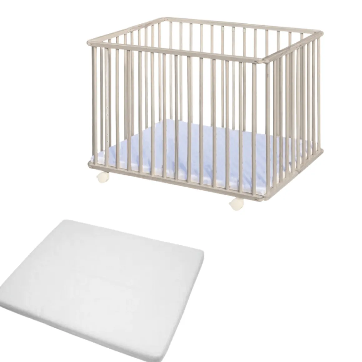 De box heeft een afmeting van 99 x 75 x 74 cm (LxBxH). De afmeting van de MDF bodemplaat is 97 x 70,5 cm. De box wordt geleverd met een bijpassend boxmatras, voor een extra comfortabele ondergrond voor je kindje. Met een gewicht van 18 kg is de box stevig en stabiel.