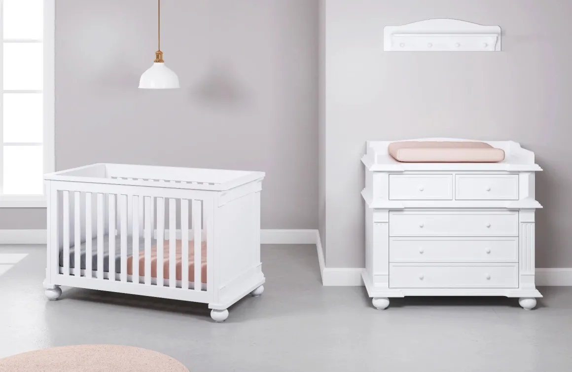De klassieke en tijdloze meubels van de witte babykamer zijn afgewerkt met sierlijke details. Hierdoor hebben de meubels een romantische uitstraling. De klassieke babykamer kan worden gedecoreerd met accessoires in jouw favoriete kleur en stijl, voor een persoonlijke touch. Deze robuuste babykamer heeft kleine oneffenheden in het hout die zorgen voor een speels en warm effect.Â