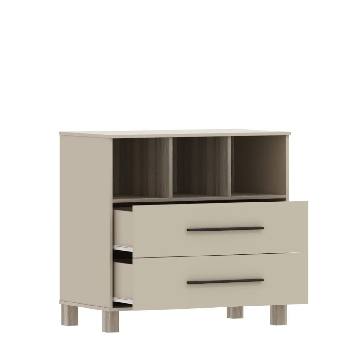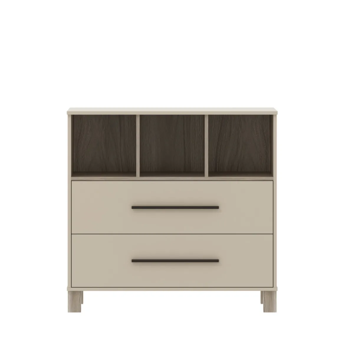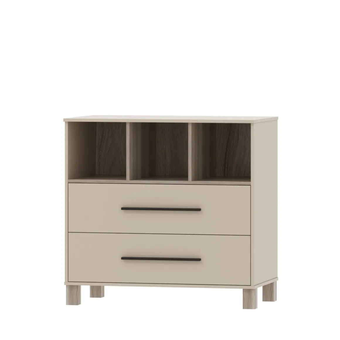 De beige commode heeft een afmeting van 90 x 92.5 x 50 cm (HxBxD). Op het commodeblad heb je voldoende ruimte voor het verschonen van je kindje. In de 2 lades van de commode en de opbergvakken heb je voldoende ruimte voor het overzichtelijk opbergen van alle babyspuletjes, zoals luiers, kledig, beddengoed en andere accessoires.Â