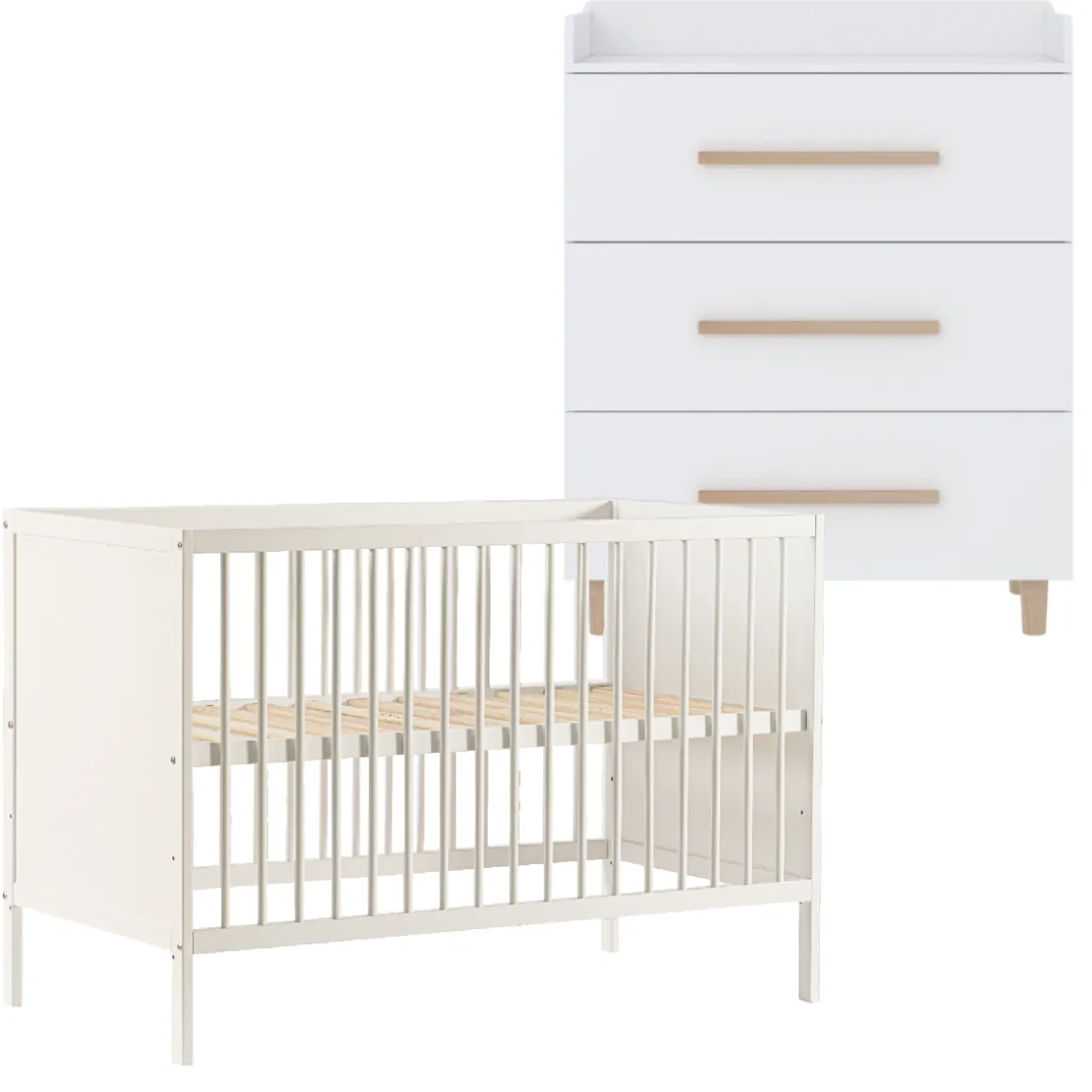 Ontdek de perfecte combinatie van stijl, veiligheid en functionaliteit met de Born Lucky Babykamer Wit 2 Delig, bestaande uit het Lola baby bed en de Stockholm commode. De babykamer biedt een zorgeloze start en een warm welkom voor je kleintje.