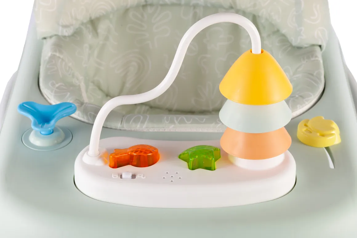 De loopstoel is voorzien van een vrolijk speelblad met leuke activiteiten die het gehoor, zicht en de fijne motoriek stimuleren. Door de kleurrijke knoppen en geluidjes blijft je kindje nieuwsgierig en betrokken. Bovendien kan het speelblad vaak worden verwijderd, zodat de loopstoel ook gebruikt kan worden als eetstoeltje of voor rustige momenten.