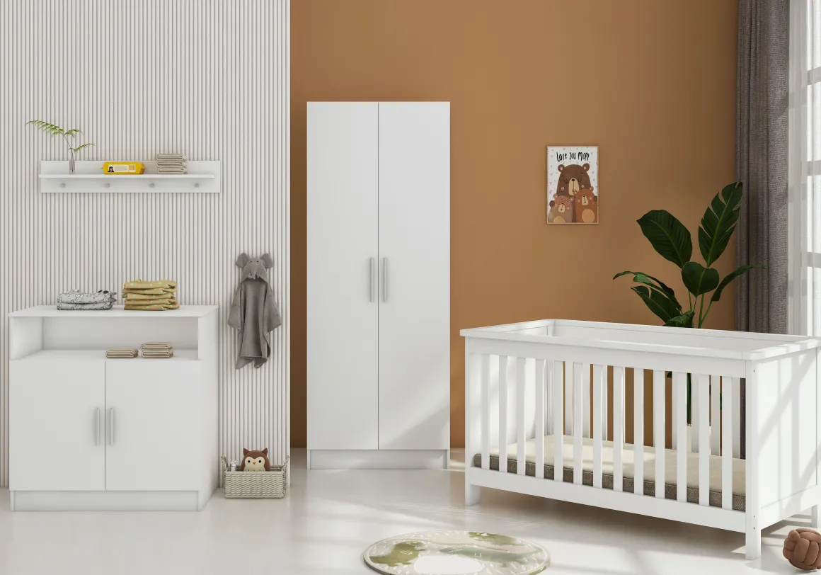 De babykamer bestaat uit een meegroei ledikant, een commode en een kledingkast. Het meegroei ledikant kan worden omgebouwd van baby bed tot peuterbed, waardoor het veel langer gebruikt kan worden!