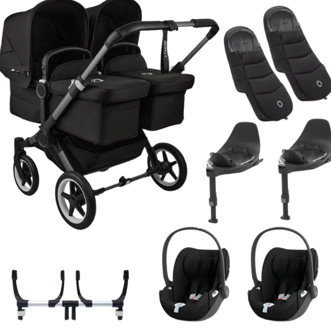 | Inbegrepen accessoires | Frame met twee reiswiegjes en twee zitjes, zonnekap, luchtdoorlatende matrasjes, boodschappenmand aan zijkant van de stoel, boodschappenmand onder de zitting, 2 groep 0 autostoelen, autostoel adapters en 2 x Isofix base |