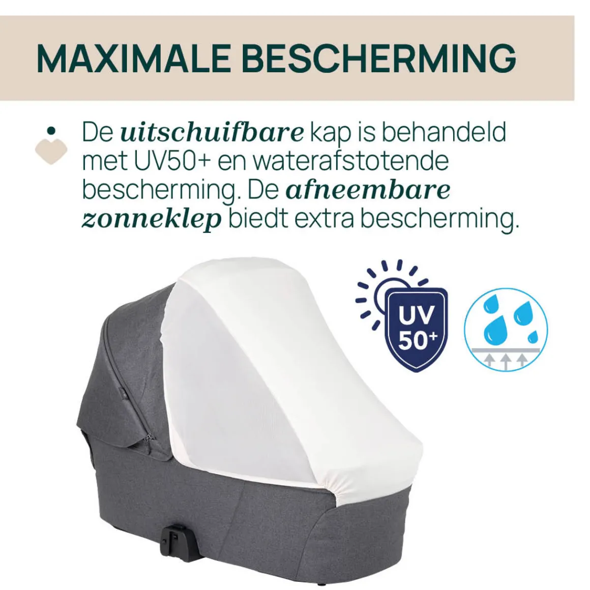 Dankzij de verstelbare kap met UV50+ bescherming en uitklapbare zonneklep, biedt de Chicco Flexi reiswieg optimale beschutting. De meegeleverde beenkap houdt je baby warm op koudere dagen.