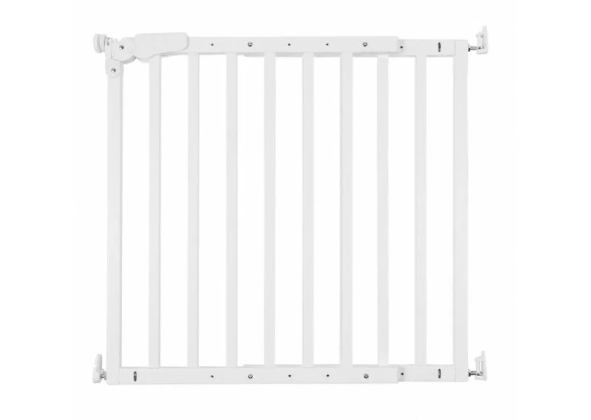 Een houten veiligheidshekje in een naturel kleur dat zowel te gebruiken is als deurhekje en als traphekje bovenaan en onderaan de trap. Het hekje heeft een variabele, gemakkelijk uit te breiden openingsbreedte van 73,5cm tot 104cm breedte. Het veiligheidshekje wordt stevig in de muur bevestigd met behulp van schroeven. Omdat het hekje niet ondersteund hoeft te worden door een extra frame, is er geen struikelgevaar. Maestro is voorzien van een safe-lock-sluitingssysteem. De sluiting kan geopend worden door de twee knoppen in te duwen en het handvat op te liften. Het hekje kan aan beide kanten geopend worden. Afmetingen: 73,5 x 3 x 76 cm