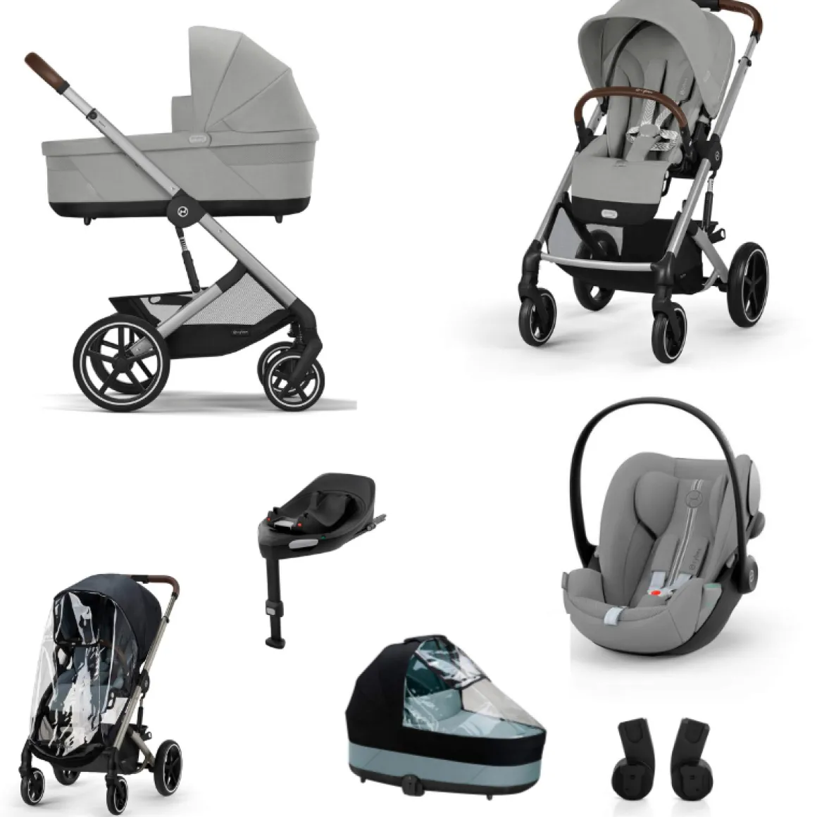 - 3 in 1 kinderwagen met Cybex groep 0 autostoel, autoadapters, Cybex Draaibare Base G en regenhoezen voor de kinderwagen en reiswieg