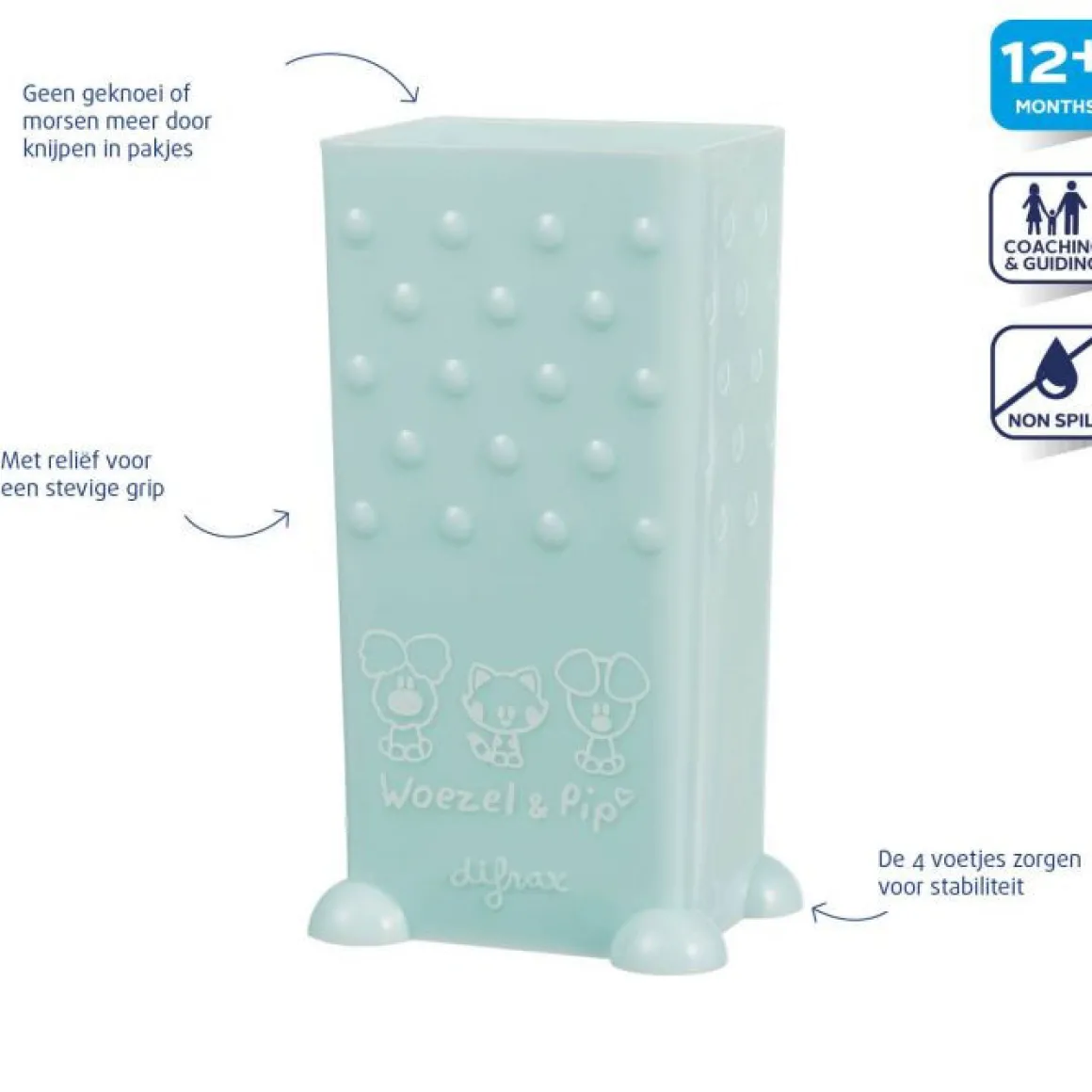 Met de Difrax Pakjeshouder Woezel En Pip Mint voorkom je knoeien en morsen. Doordat het pakje stevig in de houder zit, kan je kindje hier niet in knijpen. Geschikt voor pakjes van 150 ml en 200 ml.