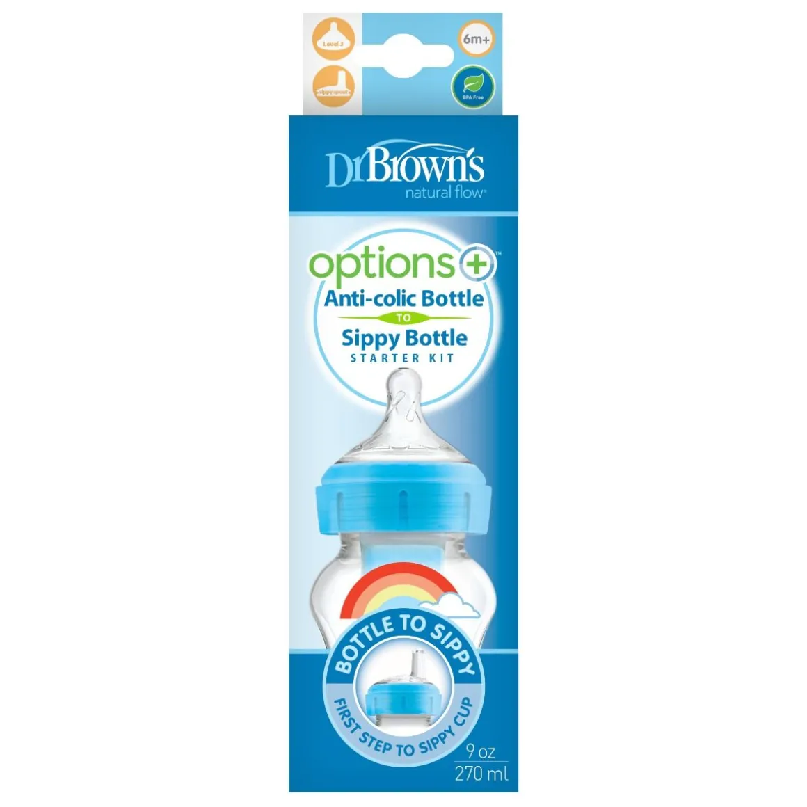 De Dr. Brown’s Starter Kit Options Brede Fles Sippy Blauw 270 helpt jouw kindje eenvoudig over te stappen van een fles naar een beker! De starterkit bestaat uit een Dr Brown’s brede halsfles, fase 3 speen en een tuitspeen. Je kunt de brede halsfles met de gewone speen gebruiken vanaf 6 maanden.