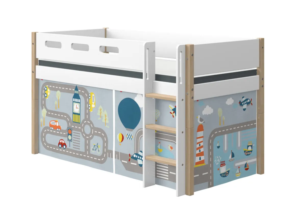 Met de Flexa Nor Halfhoogslaper Rechte Ladder + Speelgordijn Transport 90 x 200 cm maak je de slaapkamer helemaal af! Creëer met het speelgordijn een gezellig plekje onder het bed. Het speelgordijn heeft als thema Transport en stimuleert de fantasie van jouw kindje. Het matras van de halfhoogslaper is los verkrijgbaar.