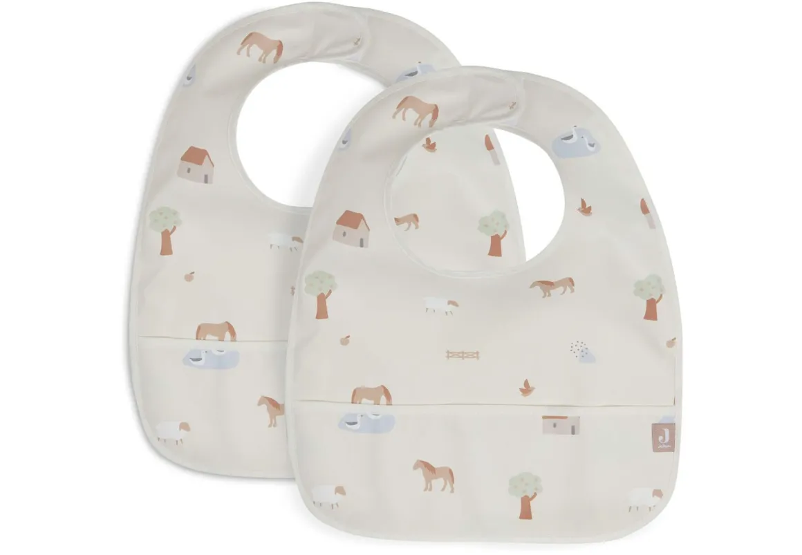 De Jollein slab waterproof farm beschermd de kleding van je kindje tegen knoeien! Het slabbetje kan gemakkelijk worden vastgemaakt doormiddel van de klittenbandsluiting aan de achterkant. Met een handig opvang vakje, zodat eten niet op de grond valt. Ze worden geleverd per twee, zodat je altijd een slabbetje achter de hand hebt.