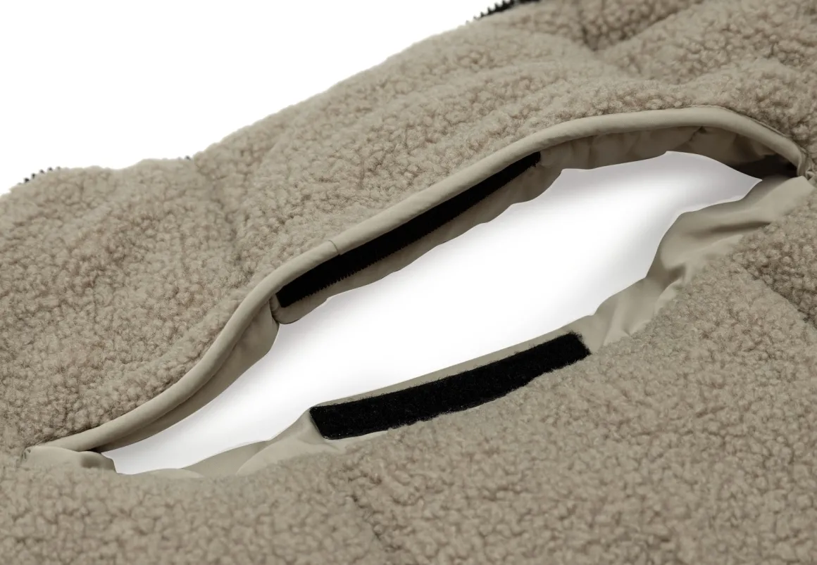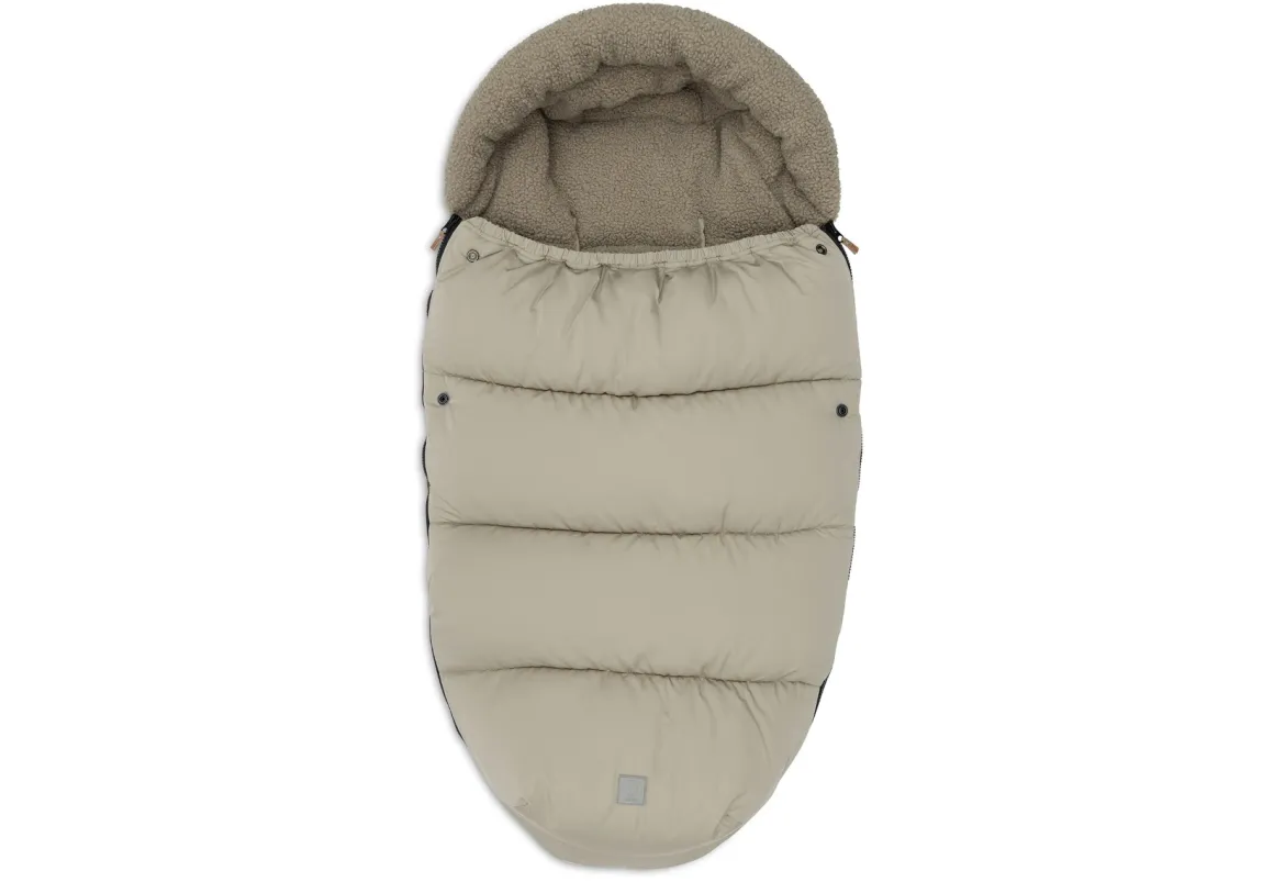 Aan de achterkant van de voetenzak bevindt zich een handige kap die om de hoofdsteun van de buggy of kinderwagen kan worden gevouwen. Zo blijft de voetenzak stevig op zijn plaats, zelfs tijdens bewegelijke ritje.