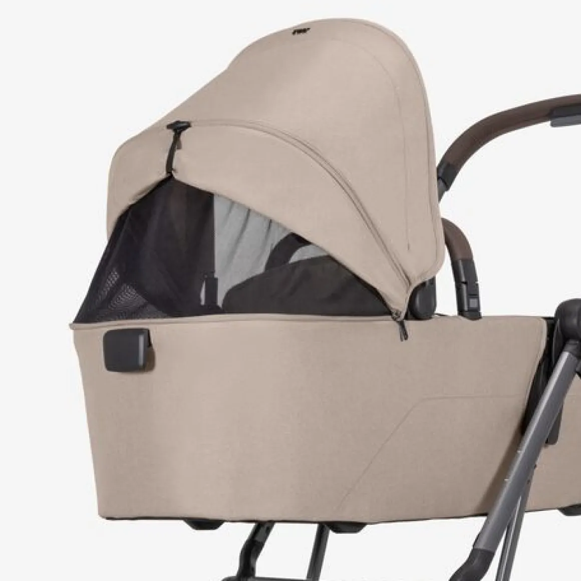 De reiswieg is voorzien van een innovatieve opvouwtechniek, waardoor hij eenvoudig plat kan worden opgevouwen met het frame. Zo hoef je nooit heen en weer te schakelen tussen het zitje en de wieg.