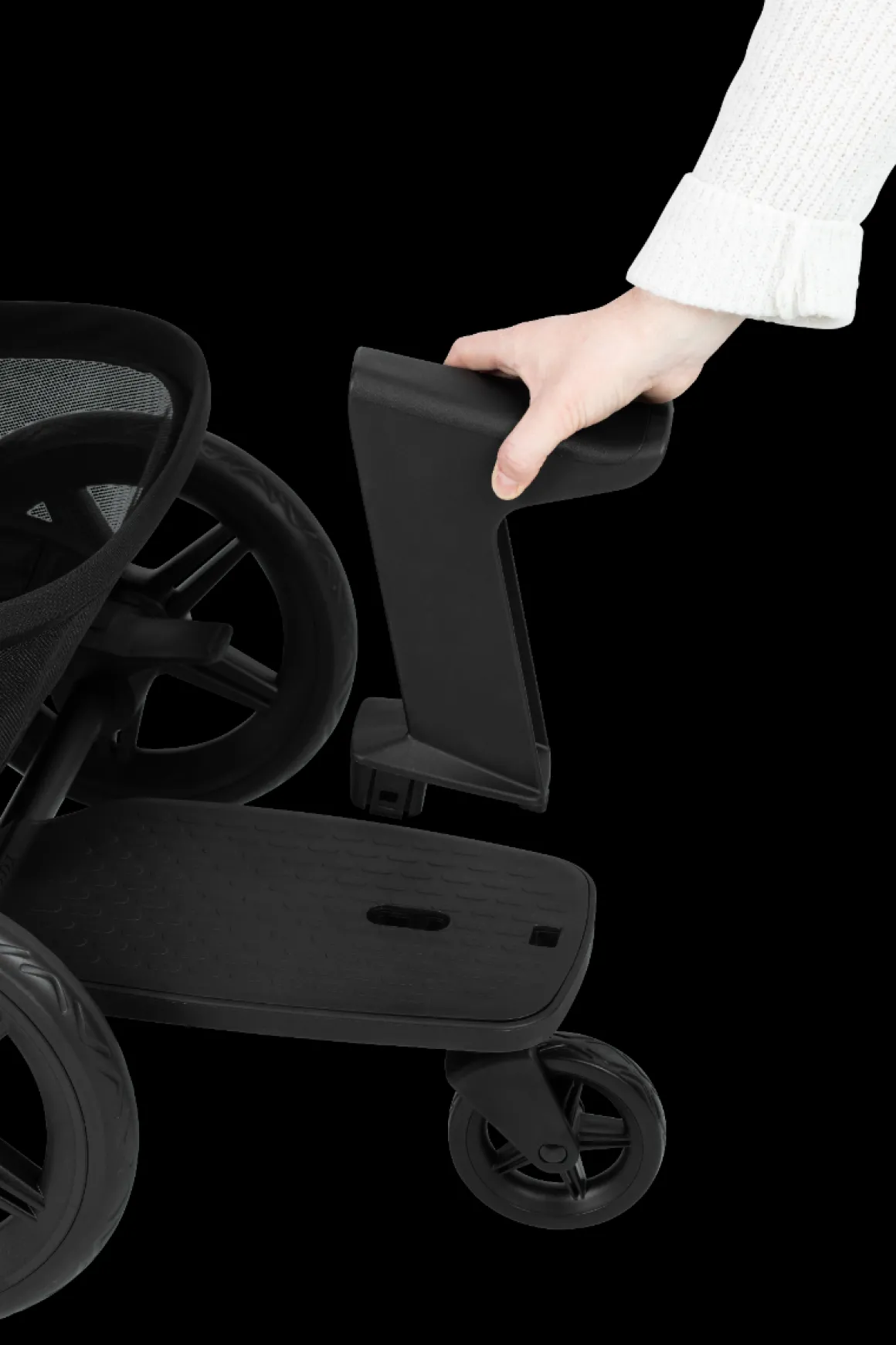 Met het meerijdpankje geniet je samen met je baby in de wagen en je peuter op het plankje van een gezellige wandeling. Het plankje biedt flexibiliteit, want je peuter kan zitten voor wat rust of staan en van de omgeving genieten. Gebruik je het plankje even niet? Je kan het eenvoudig omhoog klappen, zodat je samen verder wandelt zonder ongemak.
