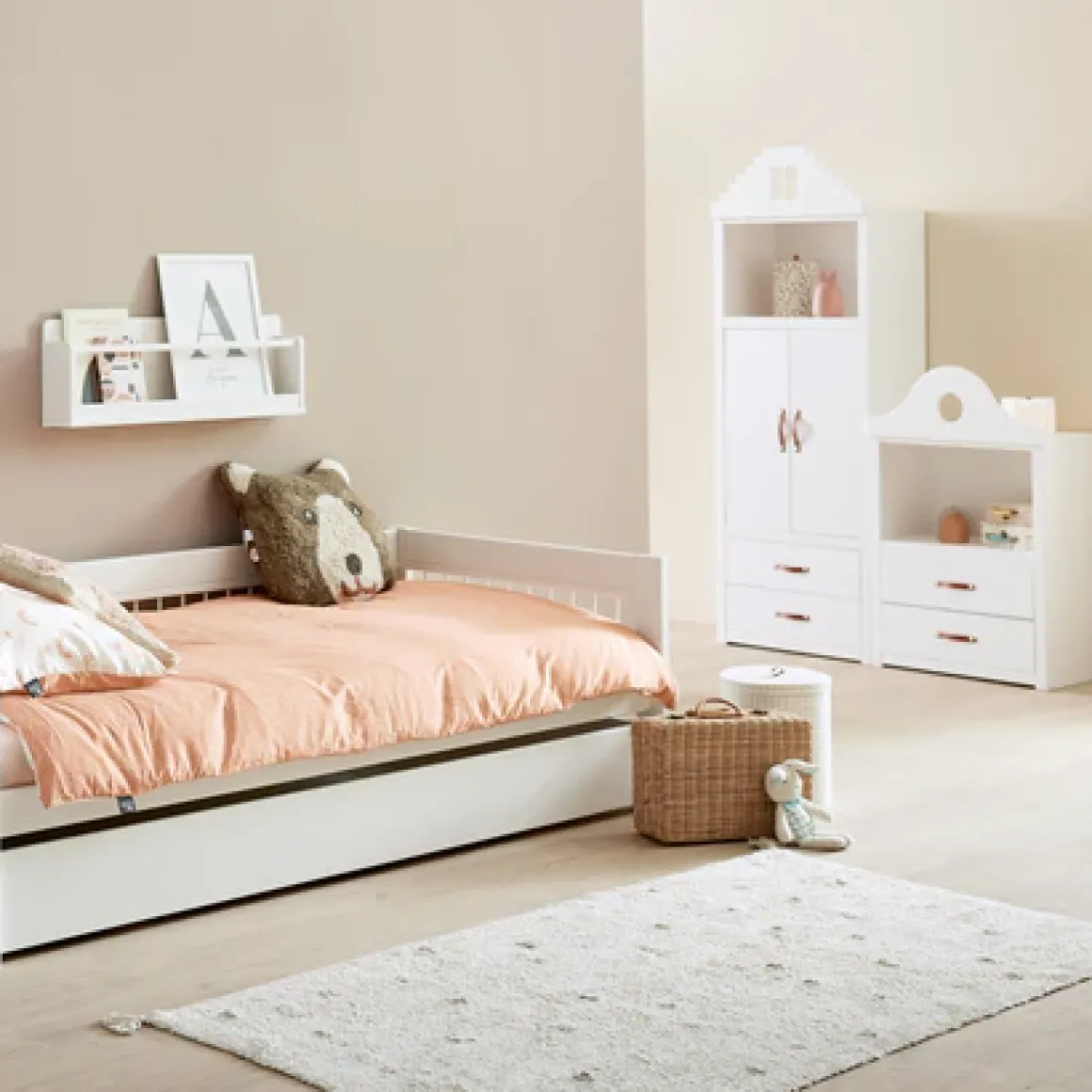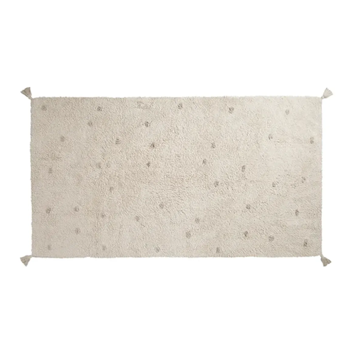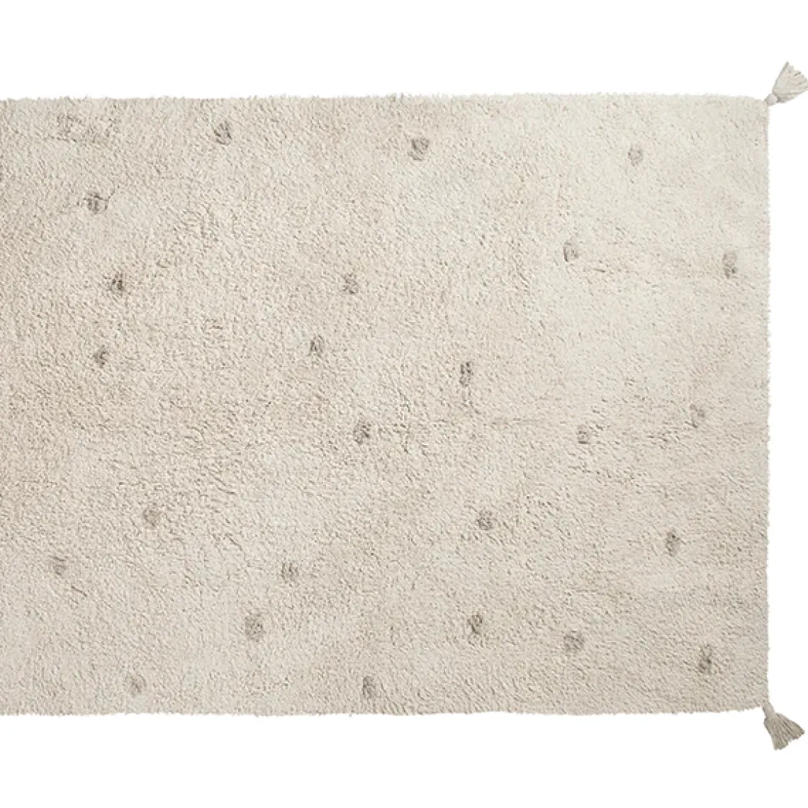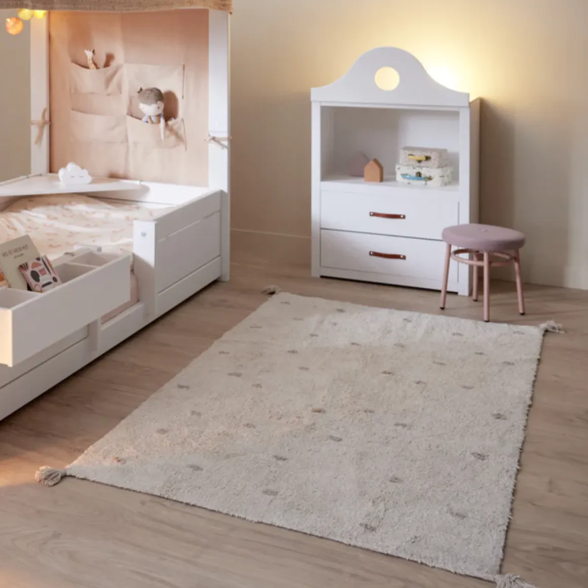 Met een natuurlijke kleur en een subtiel patroon van dots past het vloerkleed perfect in diverse interieurstijlen. De neutrale tint voegt een vleugje rust toe aan de kinderkamer.