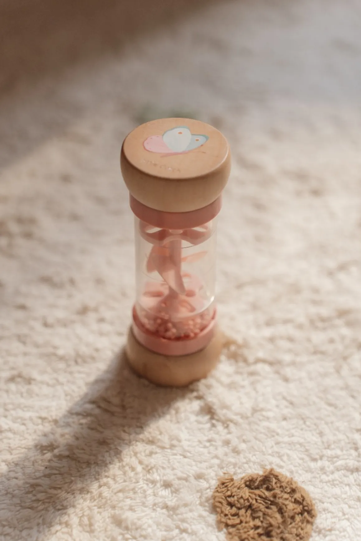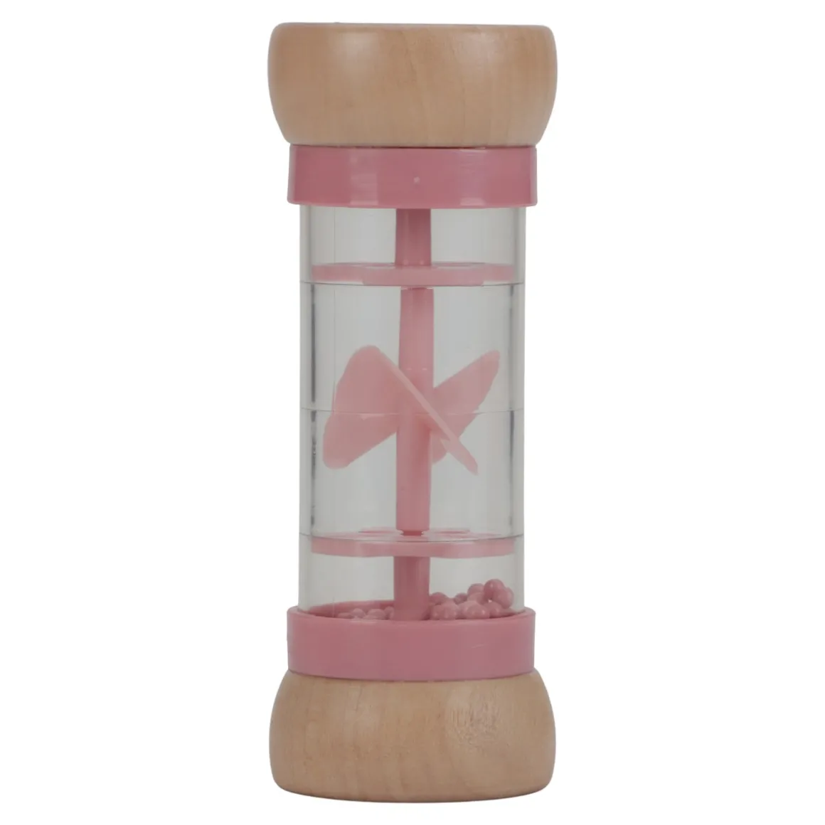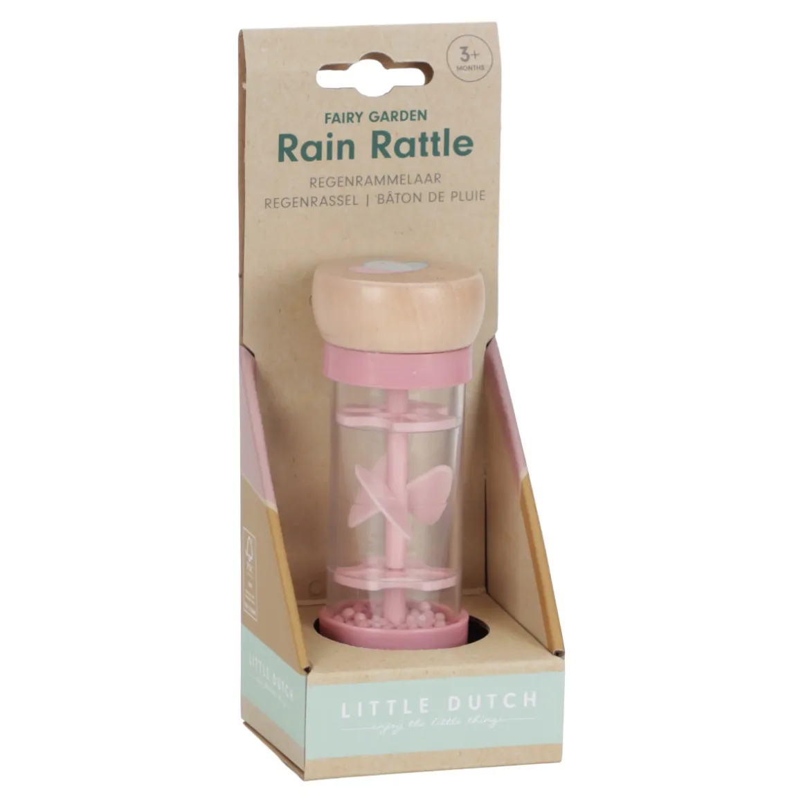 De regenrammelaar is ontworpen met kleine handjes in gedachten en ligt comfortabel in de greep van je baby. Het speeltje is voorzien van een houten boven- en onderkant die zijn versierd met schattige tekeningen van een schaap en een kip. Deze aantrekkelijke ontwerpen maken deel uit van onze Fairy Garden collectie, waardoor de regenrammelaar niet alleen leuk is om mee te spelen, maar ook een charmante toevoeging aan de kinderkamer.