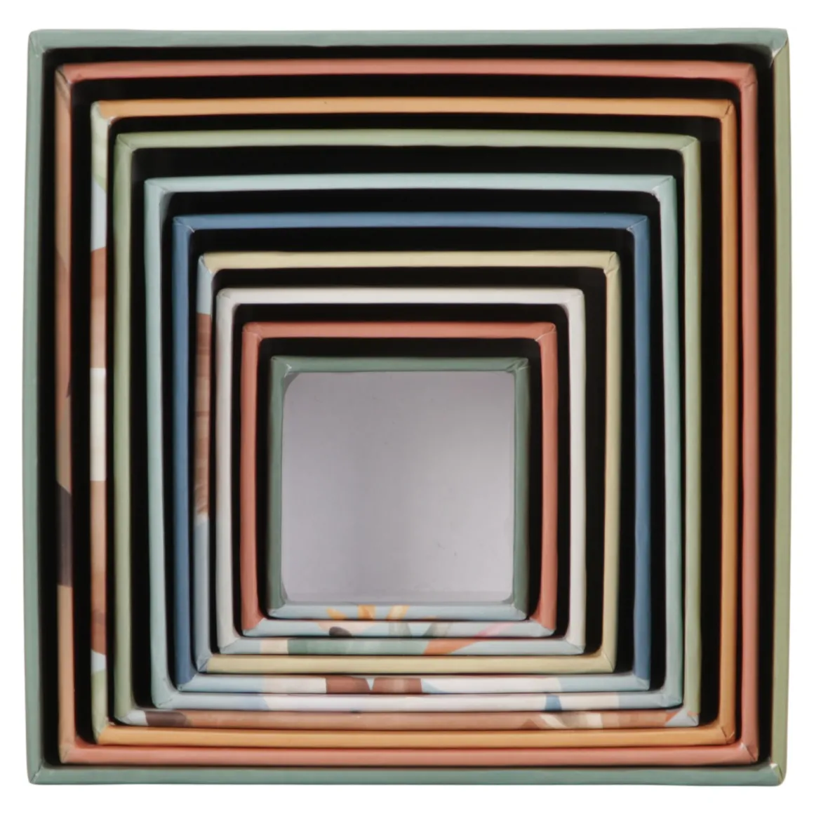 De stapelblokken zijn gemaakt van stevig karton, wat ze duurzaam en bestand maakt tegen intensief gebruik door kleine kinderhandjes. Het kleinste blokje heeft een formaat van 5 cm, terwijl het grootste blokje 14 cm meet, wat zorgt voor variatie en uitdaging bij het stapelen. Dankzij het praktische ontwerp kunnen de kleinere blokjes eenvoudig in de grotere blokken worden opgeborgen, wat opruimen en opbergen een fluitje van een cent maakt.