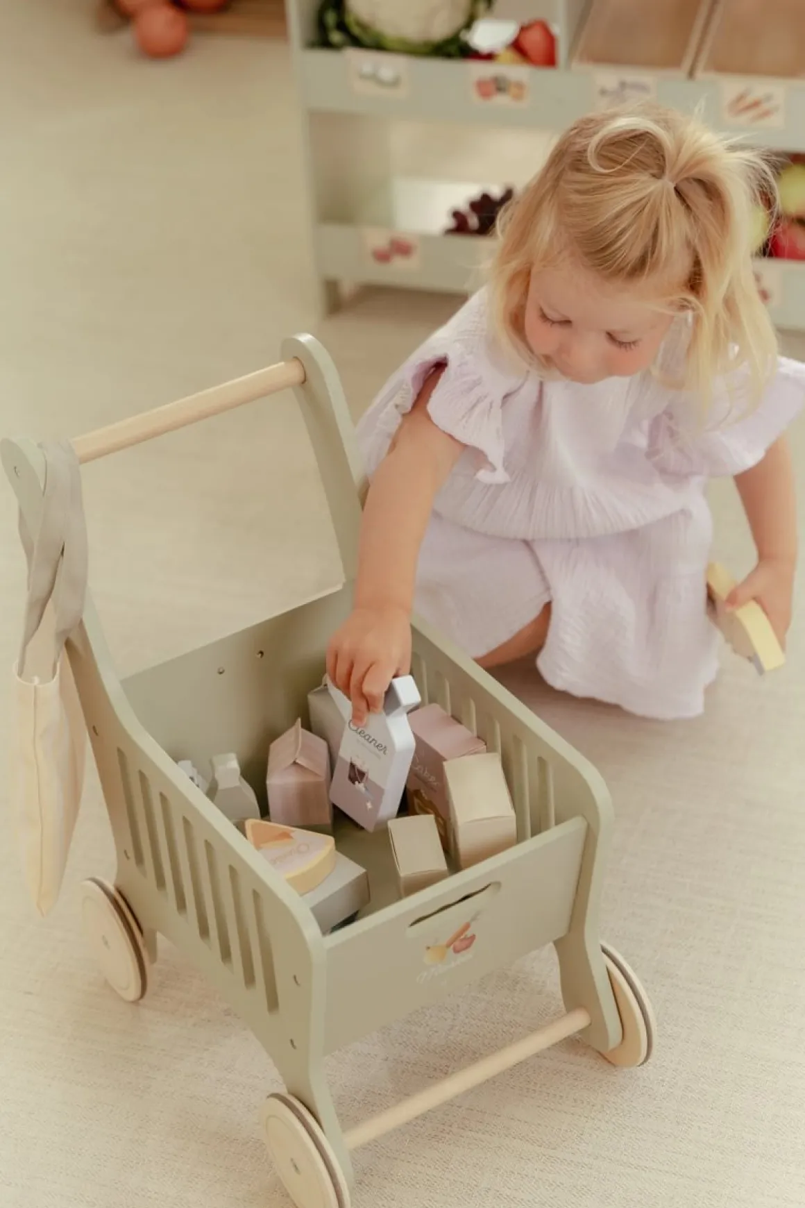 Met de Little Dutch winkelwagen kunnen kinderen hun eigen boodschappenavontuur beleven. Het stevige houten ontwerp en de vrolijke kleuren nodigen uit tot rollenspel, waarbij kinderen spelenderwijs leren over winkelen en organiseren. Perfect te combineren met andere Little Dutch speelsets, zoals de marktkraam of het snijfruit, voor nog meer plezier.