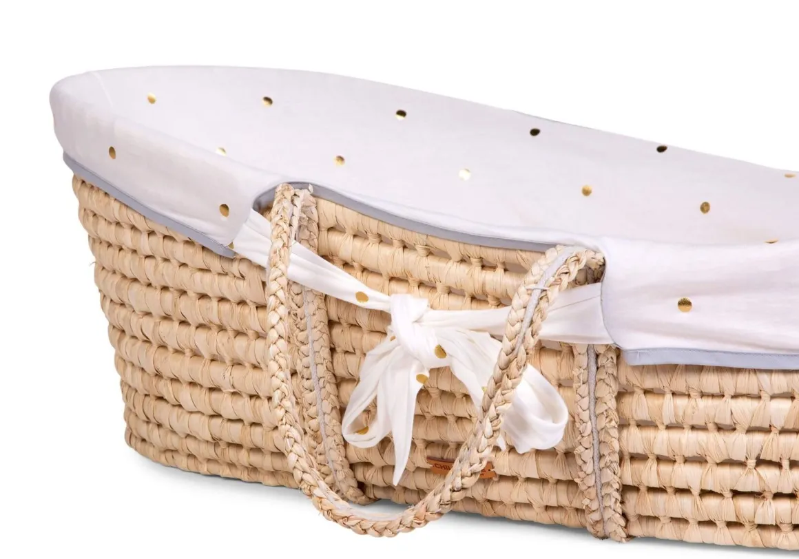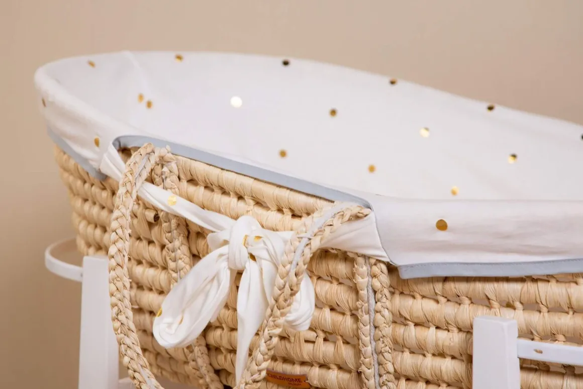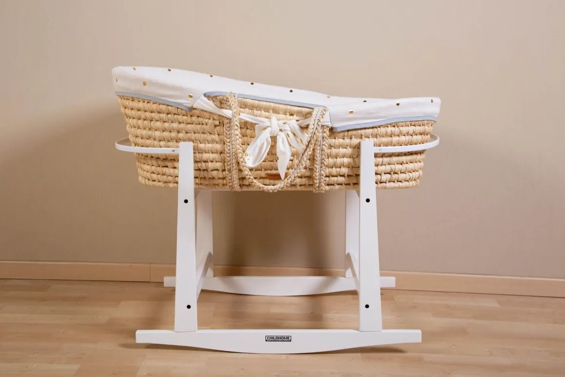 De Moses mand van Childhome wordt geleverd inclusief matras en jersey hoes (Goud stippen) maar exclusief standaard!