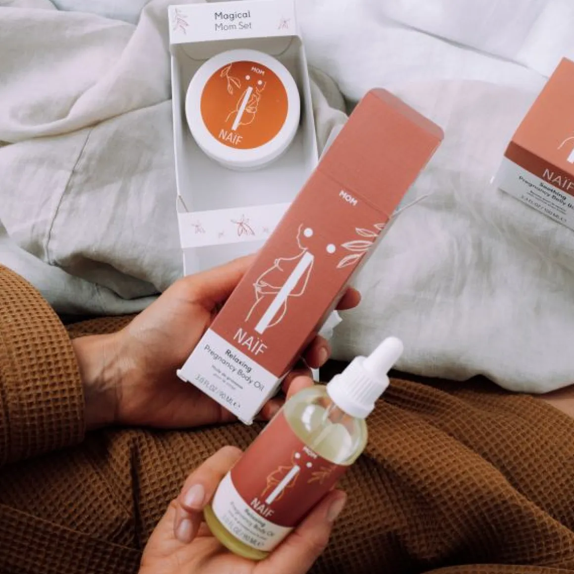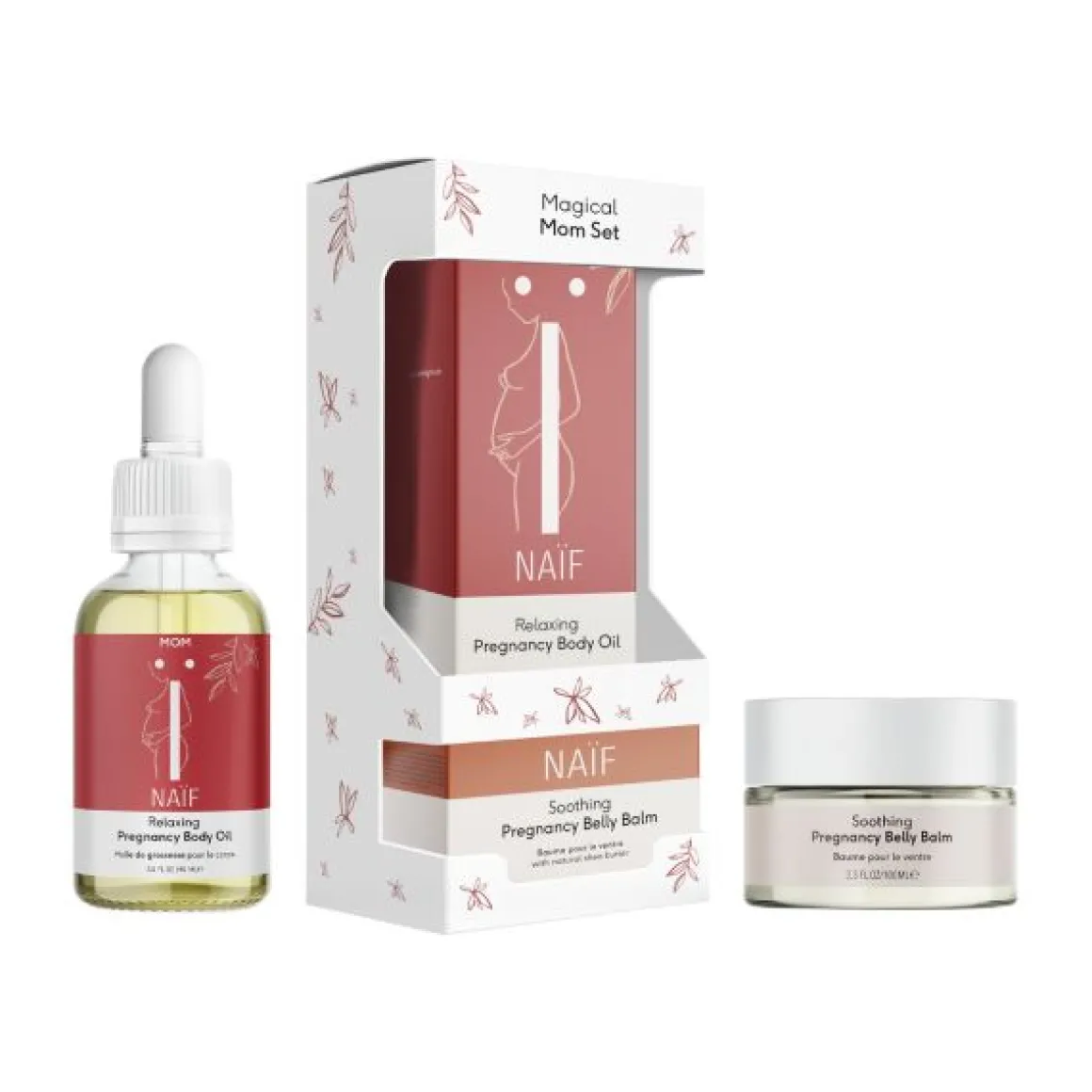 De Naïf Magical Mom Set ondersteunt het natuurlijke groeiproces van het lichaam tijdens de zwangerschap. De set bestaat uit een zwangerschapsolie en zwangerschapsbalsem met shea butter, jojoba olie en sesamolie. De jojoba olie helpt striae te voorkomen. De lavendelgeur van de olie helpt het lichaam te ontspannen. De balsem hydrateert en hersteld de huid van je groeiende buik.