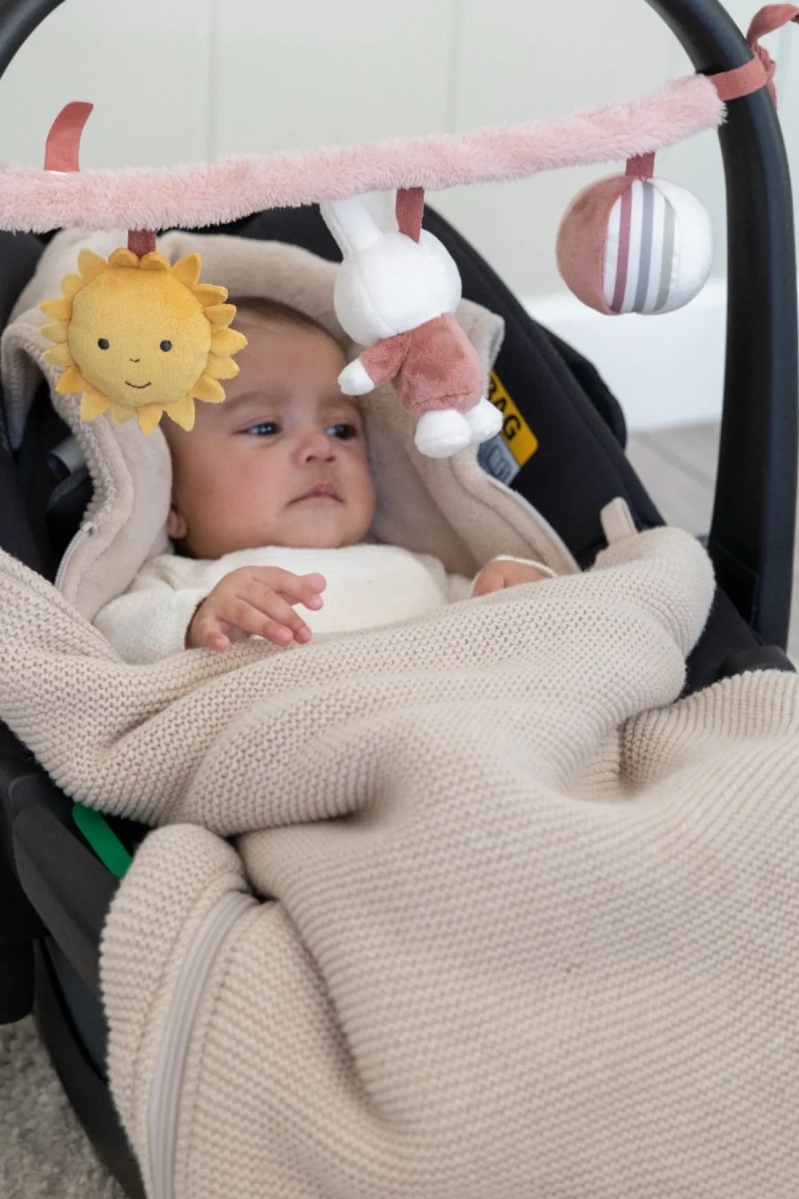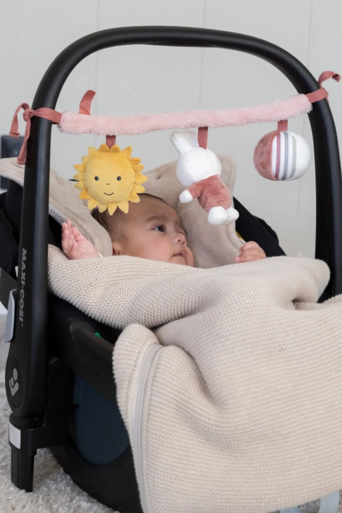 De Nijntje Wagenspanner Fluffy pink is gemaakt van polyester en is direct vanaf de geboorte te gebruiken. De wagenspanner is ongeveer 42 centimeter en bevat drie speeltjes met elk een andere activiteit: knisperpapier, een pieper en een rammelaar. De wagenspanner is eenvoudig te bevestigen aan de kinderwagen of autostoel door middel van de lusjes.
