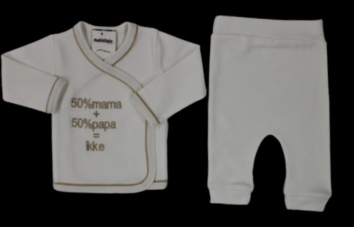 Het broekje is voorzien van een elastische tailleband zodat deze nooit te strak rond de buik van je kleintje zit, ideaal! Het shirtje heeft een eenvoudige overslagsluiting van drukknoopjes zodat aan- en uitkleden kinderspel wordt. De leuke tekstopdruk ‘50% Mama + 50% Papa = ikke’ maakt dit setje af!