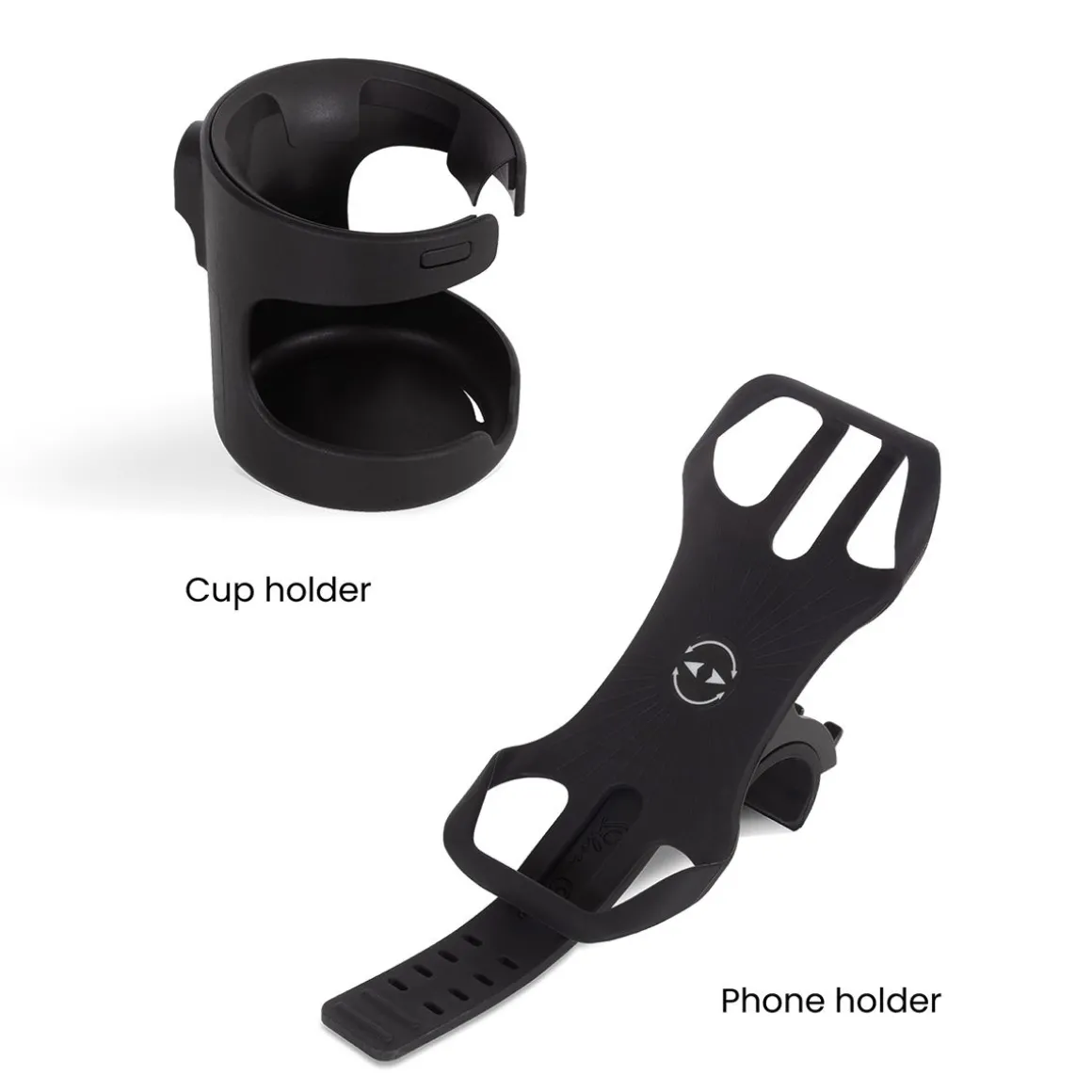 De siliconen telefoonhouder is geschikt voor alle telefoonmodellen en kan eenvoudig worden bevestigd aan de kinderwagen. Dankzij de 360° draaiende functie kun je gemakkelijk je telefoon gebruiken terwijl deze veilig bevestigd blijft. De set wordt compleet gemaakt met een bekerhouder die geschikt is voor diverse flessen en drinkbekers, zodat je altijd je drankje binnen handbereik hebt.