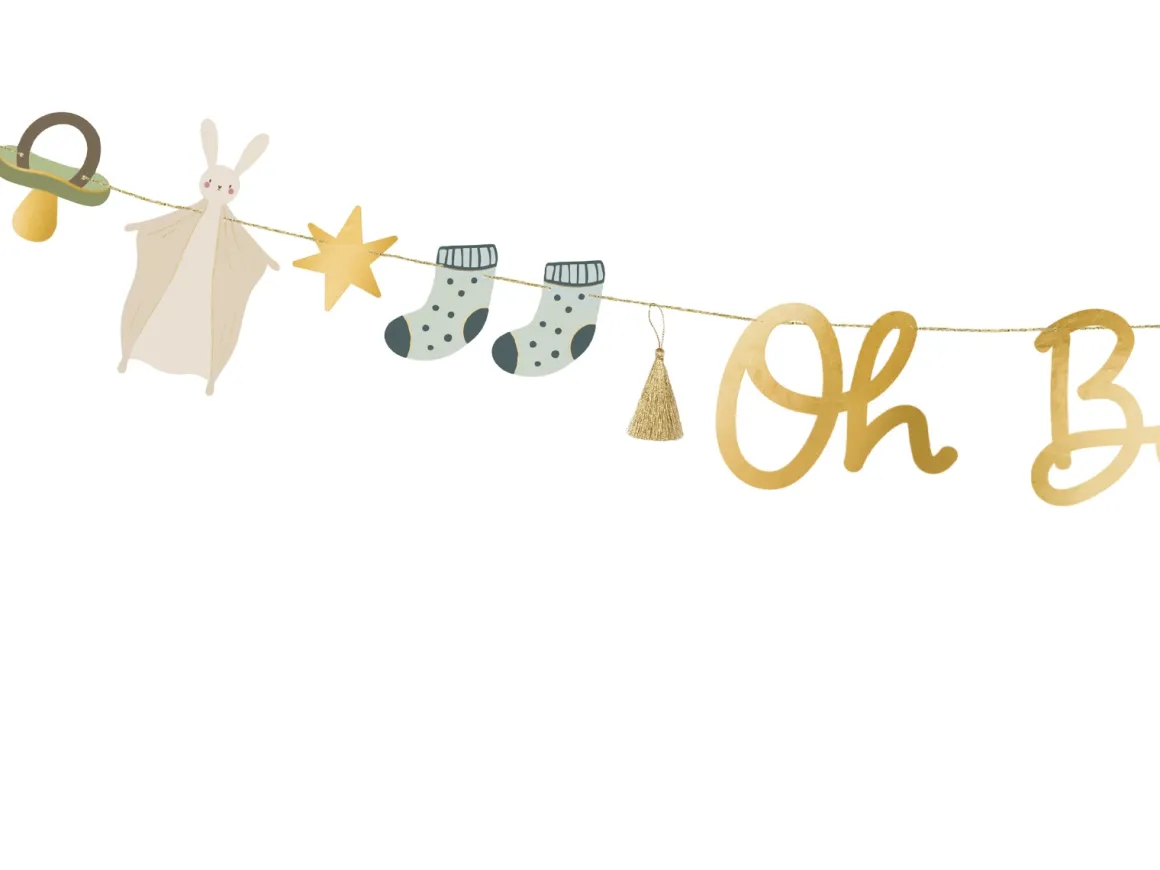 - Er hangen vrolijke baby gerelateerde versiersels aan de slinger