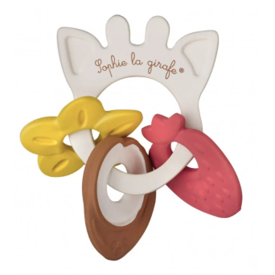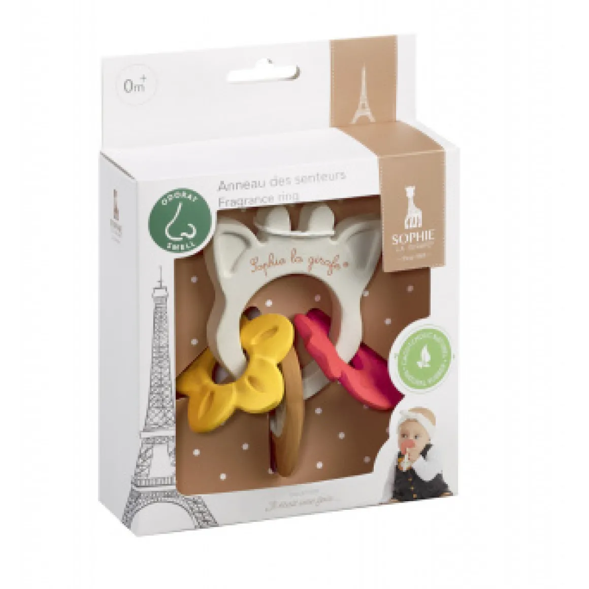 De bijtring is voorzien van drie verschillende ringen, elk doordrenkt met een heerlijke geur. Aardbei, Vanille en Kokos bieden een variatie aan subtiele en aangename aroma’s die de zintuigen van je baby prikkelen.