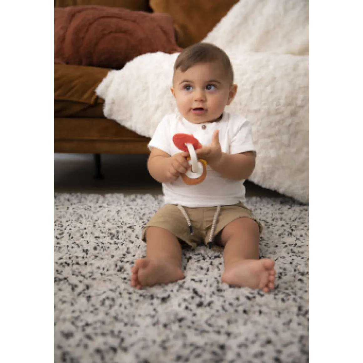 De bijtring is niet alleen functioneel maar ook visueel aantrekkelijk. De vrolijke kleuren en verschillende texturen nodigen je baby uit tot ontdekken en spelen.