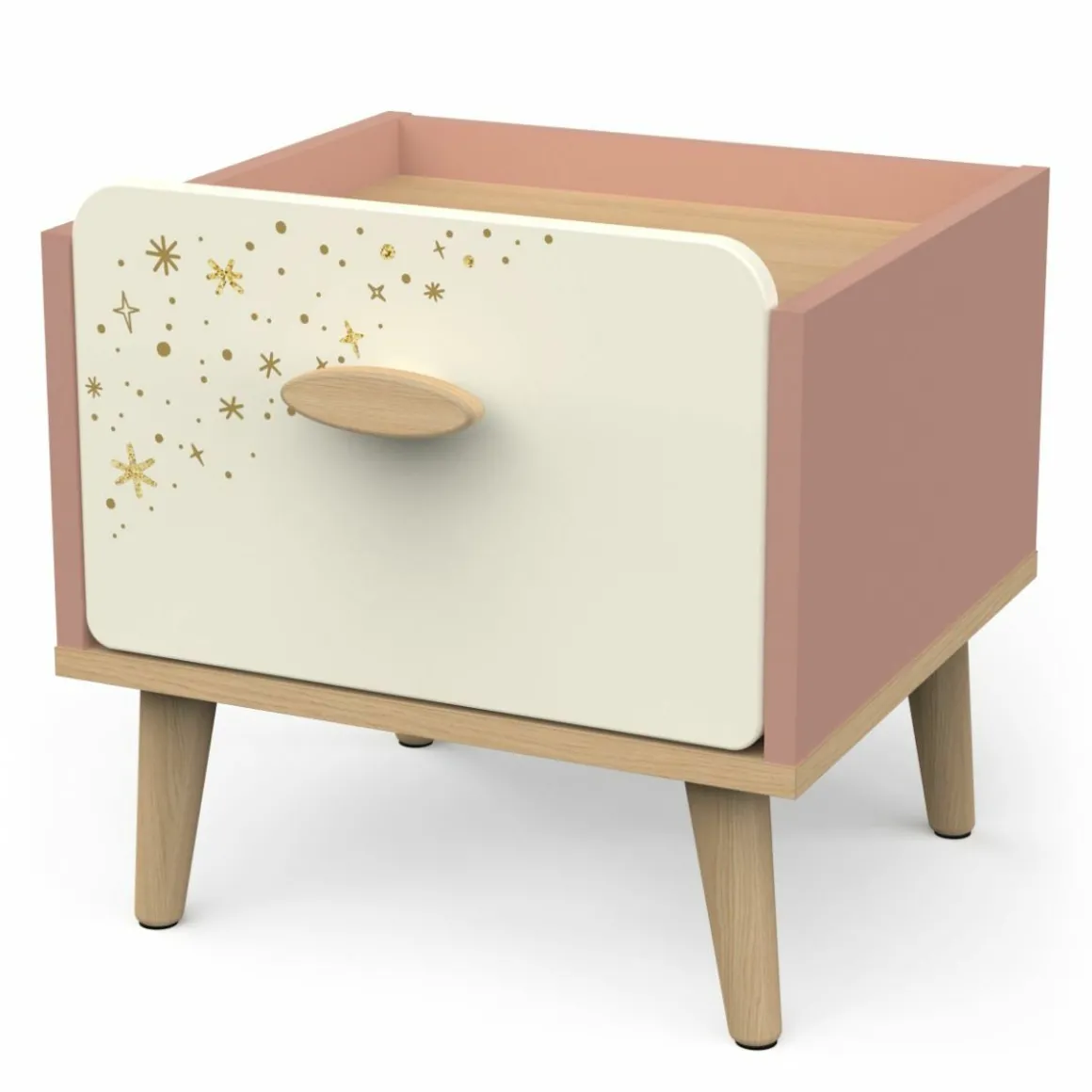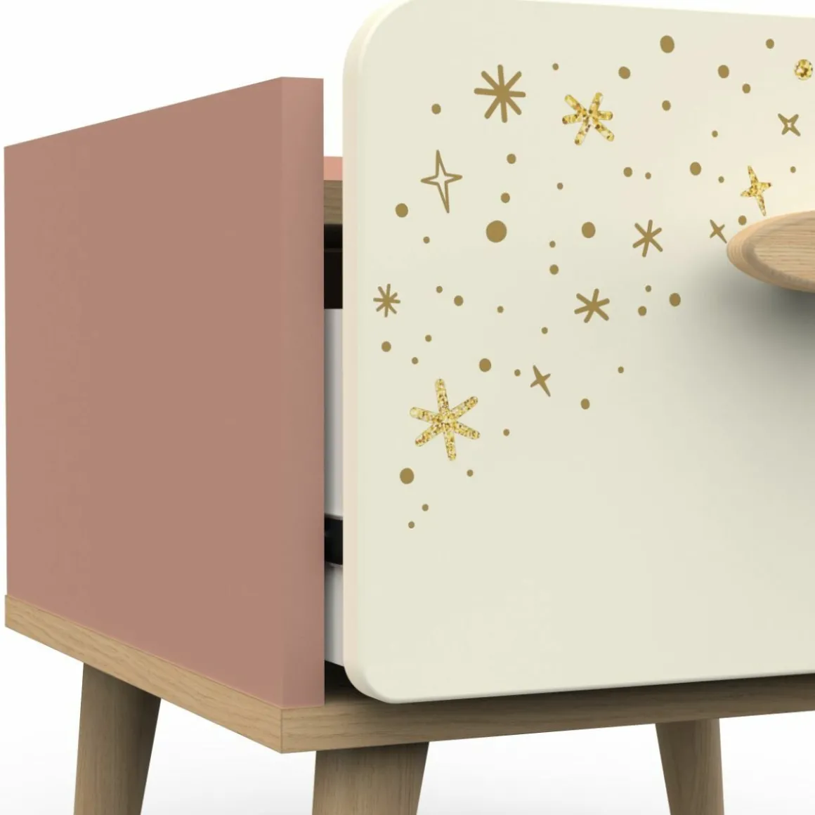 Het Suzie nachtkastje is de perfecte toevoeging aan iedere kinderkamer en zorgt voor een speelse en gezellige uitstraling. Met de sterrendetails en het tijdloze ontwerp past dit kastje moeiteloos bij de rest van de Suzie-lijn, waardoor je een harmonieuze inrichting kunt creëren. De combinatie van eik, abricot en beige geeft het nachtkastje een warme en moderne uitstraling die zowel kinderen als ouders aanspreekt.