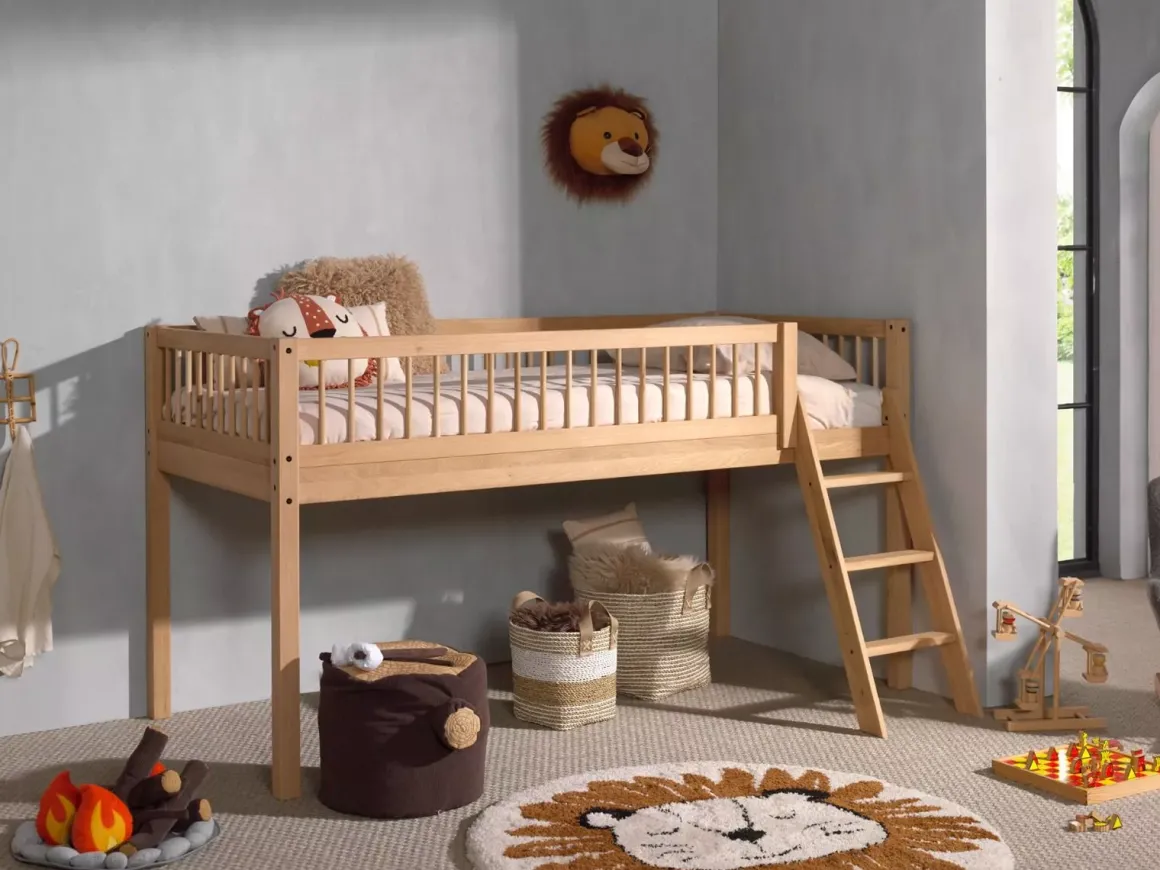 Onder de halfhoogslaper is volop ruimte beschikbaar, waardoor de kinderkamer optimaal benut kan worden. Dit open gedeelte kan gebruikt worden als speelruimte of als extra opbergruimte voor speelgoed, manden en opbergboxen. Met een bijpassende speeltent of textielset kan een knusse en speelse omgeving worden gecreëerd, wat de halfhoogslaper nog specialer maakt.