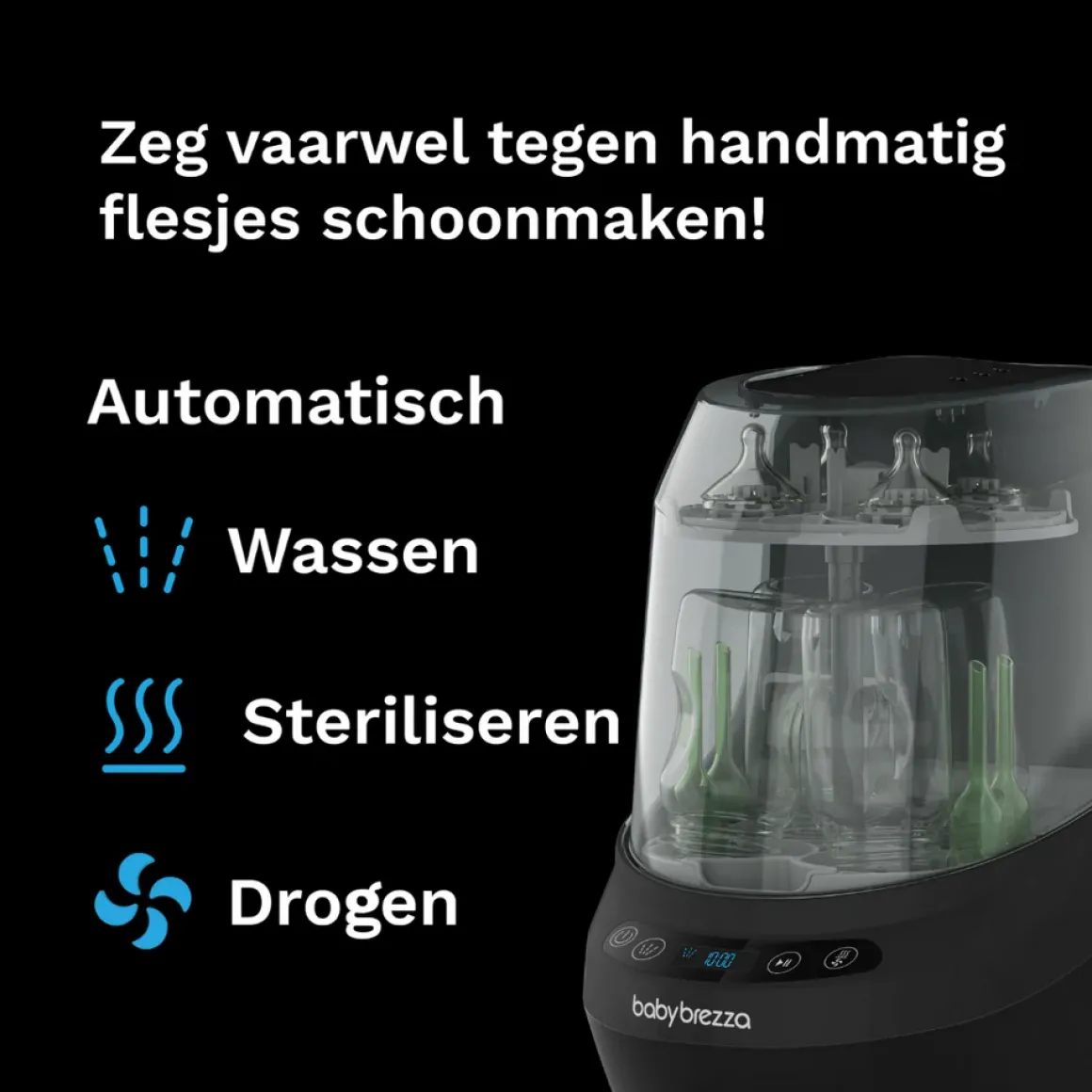 De Baby Brezza Bottle Washer Pro biedt ouders een revolutionaire manier om babyflessen, kolfonderdelen en drinkbekers schoon en steriel te houden. Deze machine neemt al het zware werk uit handen door automatisch te wassen, te steriliseren en te drogen, zodat je nooit meer een flessenborstel nodig hebt. Met 20 hogedrukstralen wordt alles krachtig en grondig gereinigd. De stoomsterilisatie doodt 99,9% van de bacteriƫn en daarna zorgt de HEPA-gefilterde hete lucht voor een perfecte droging.
