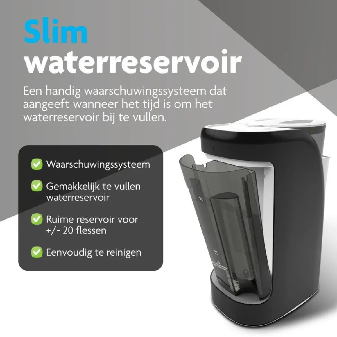 - Een flesje op de juiste temperatuur binnen 10 seconden met één druk op de knop