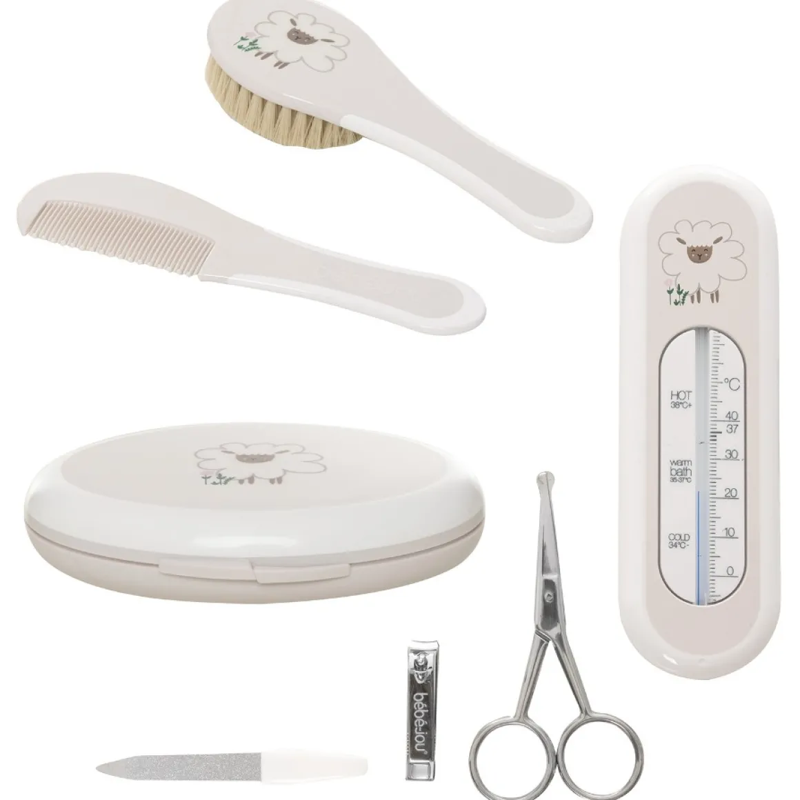 De Bébé-Jou Geschenkset bevat drie onderdelen; de kapset (een borstel en een kam), een badthermometer en een manicureset. De kapset bestaande uit een kam en een borstel, is speciaal ontworpen voor baby’s en is gemaakt van zachte, natuurlijke materialen. De badthermometer is ontworpen om ervoor te zorgen dat het badwater altijd de perfecte temperatuur heeft voor je kleintje. De manicureset bevat een nagelschaartje, een nagelknippertje en een nagelvijltje. Elk van deze hulpmiddelen is zorgvuldig ontworpen en veilig in gebruik voor baby’s.