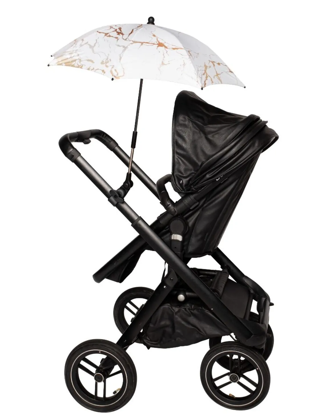 De Bellasol parasol Marble White is een mooie universele parasol met een gaaf marble printje. De luxe parasol is te combineren met alle kinderwagens of buggy’s en heeft een bescherming van UPF50+.