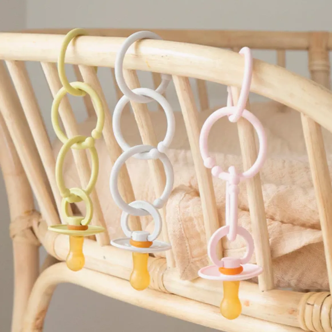 Maak kettingen van de ringen zo lang als je wilt! De loops kunnen dienen als hangers voor aan de babygym, als wagenspanner of als fopspeenketting. De creatieve mogelijkheden zijn eindeloos.