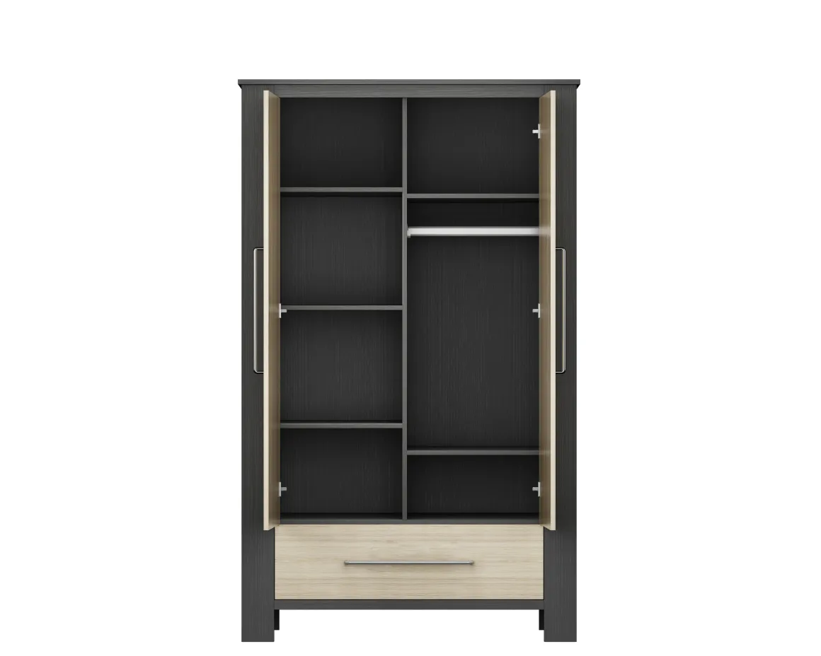 De kledingkast heeft een ruim hang- en leggedeelte en een opberglade.