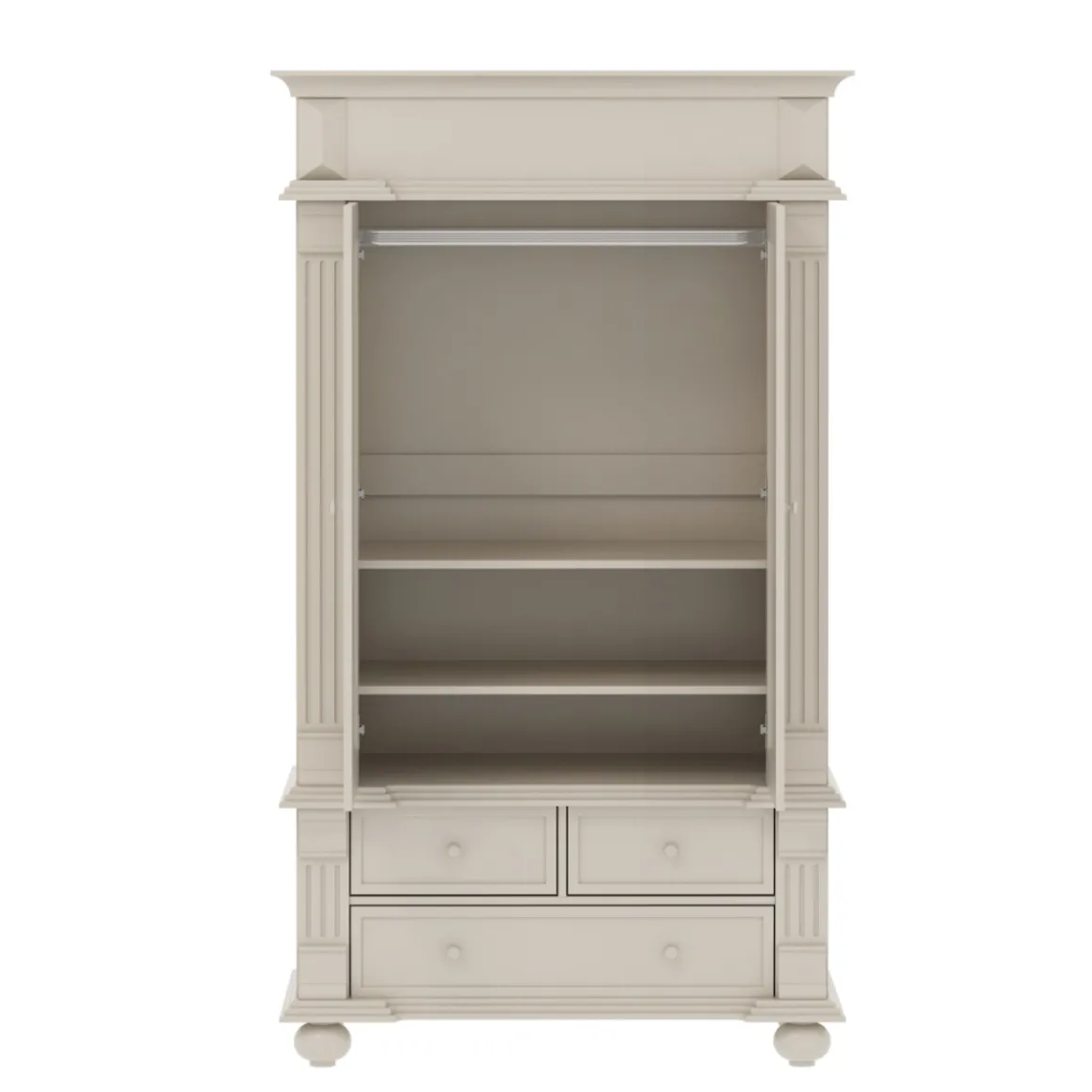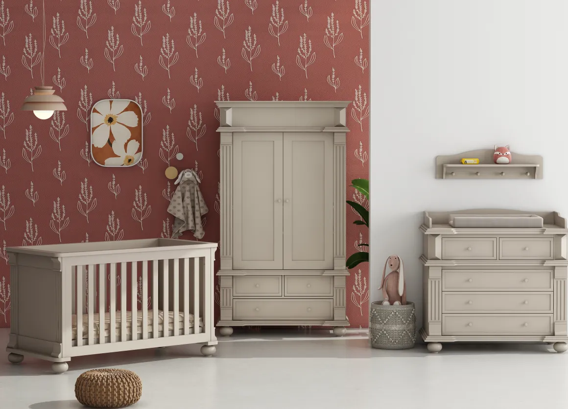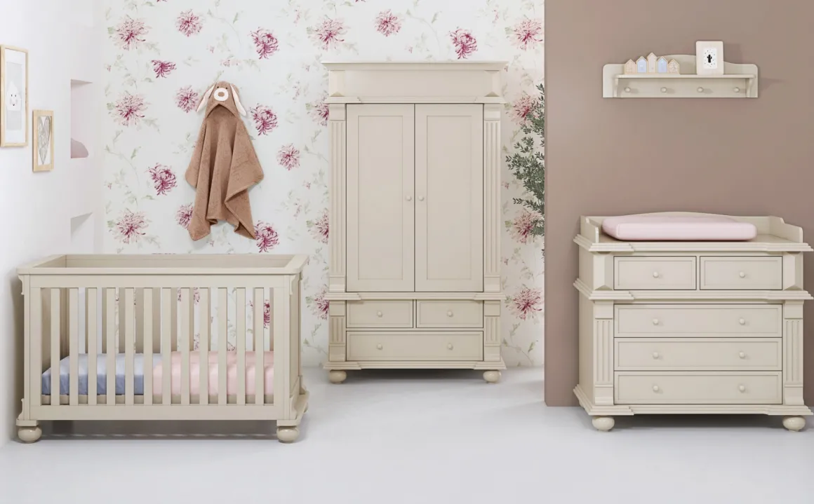 De klassieke meubels van de beige babykamer zijn afgewerkt met sierlijke details. Hierdoor hebben de meubels een romantische uitstraling. De complete babykamer kan worden gedecoreerd met accessoires in jouw favoriete kleur en stijl, voor een persoonlijke touch. Deze robuuste babykamer heeft kleine oneffenheden in het hout die zorgen voor een speels en warm effect.Â