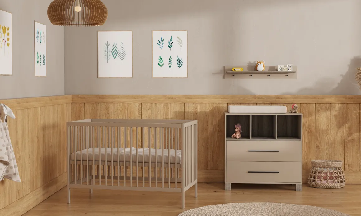 De beige babykamer is geproduceerd van duurzaam FSC-hout. Dit kwalitaitef uitstekende hout is afkomstig uit verantwoord beheerde bossen. Dankzij de stevige constructie van de meubels en het duurzame materiaal waarvan ze vervaardigd zijn, zullen jij en je kindje jarenlang plezier beleven van de babykamer.Â