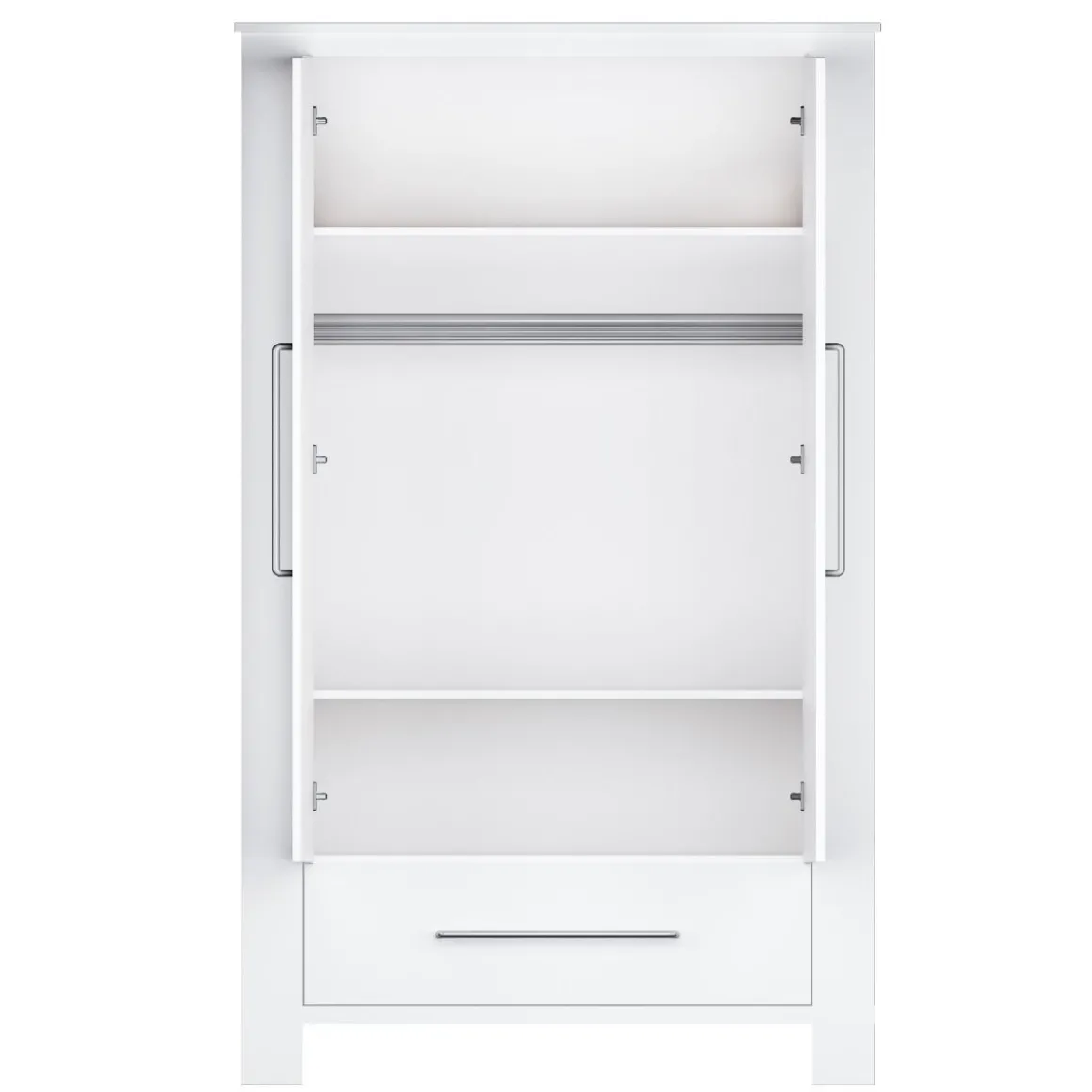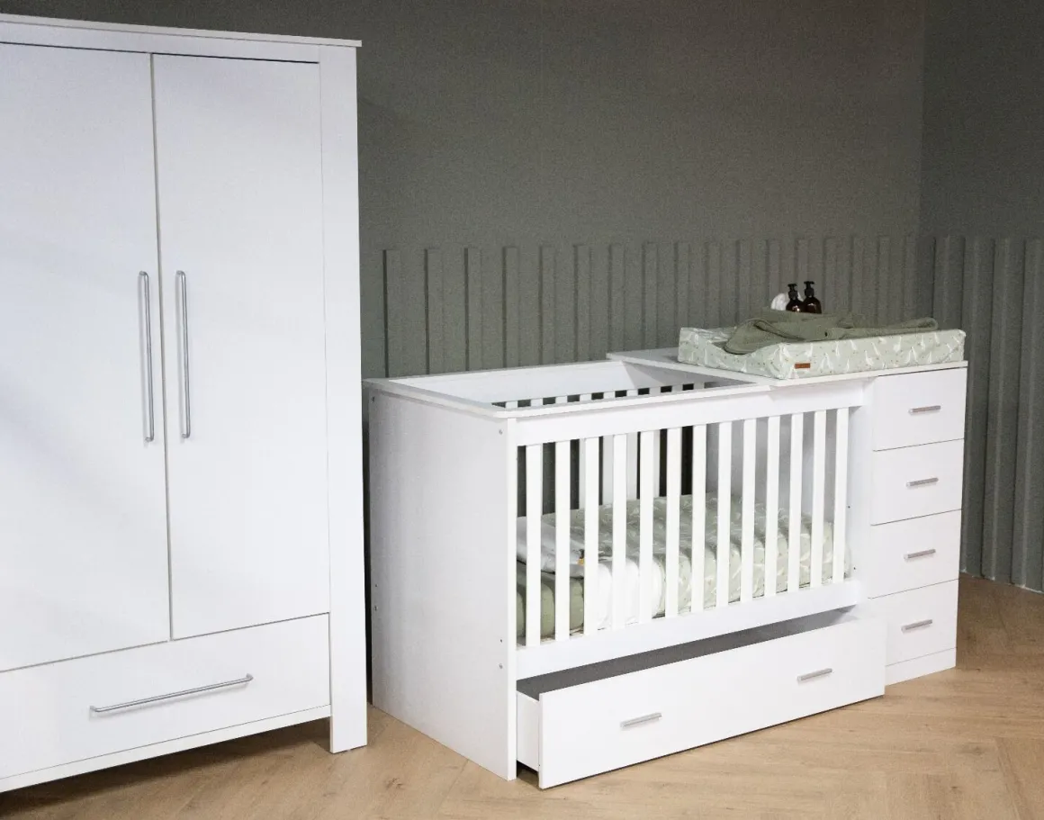 Ben je op zoek naar een multifunctionele babykamer? Dan is Born Lucky Babykamer Memphis Wit de perfecte combinatie! De meubels passen perfect in iedere ruimte, ook in een kleine babykamer. Het combi ledikant is een baby bedje, commode en kledingkast in één. Het biedt biedt alle gemakken van een complete babykamer, zonder dat het veel ruimte in beslag neemt. De kledingkast zorgt voor extra opbergruimte.