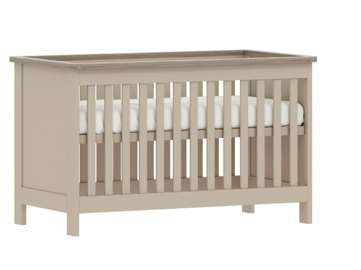 De Born Lucky Babykamer Noah Clay 2 Delig bestaat uit een baby bedje en een commode. De stijlvolle en neutrale meubels zijn afgewerkt met stoere details. De rand van het baby bedje heeft een eikenhouten kleur en ook de frontjes van de lades van de commode zijn hier mee afgewerkt. De zwarte handgrepen op de commode geven de babykamer een stoere touch.