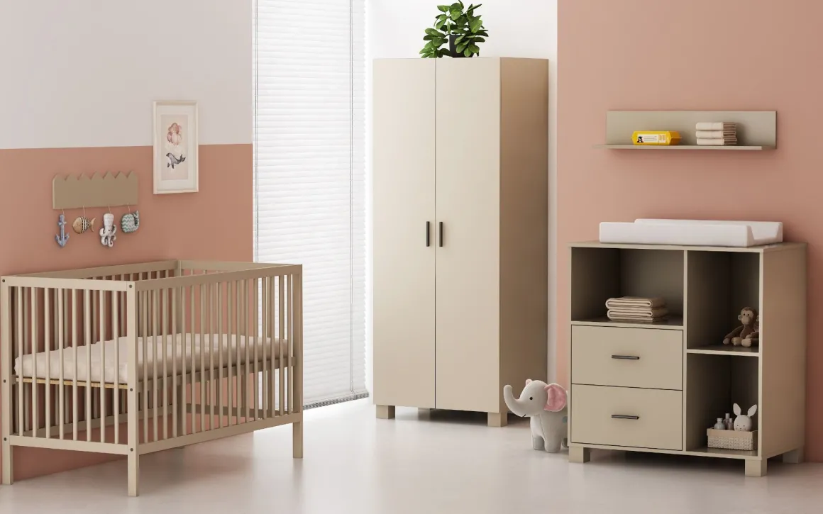 De Rio kledingkast maakt de babykamer compleet en zorgt voor extra opbergruimte. Met een hoogte van 180 cm en een breedte van 70 cm biedt deze kast voldoende plek voor kleding, beddengoed en andere babybenodigdheden. De indeling is overzichtelijk, waardoor je alles netjes kunt organiseren. De stijlvolle afwerking en zachte kleur sluiten perfect aan bij het bed en de commode, waardoor de kamer één harmonieus geheel vormt.