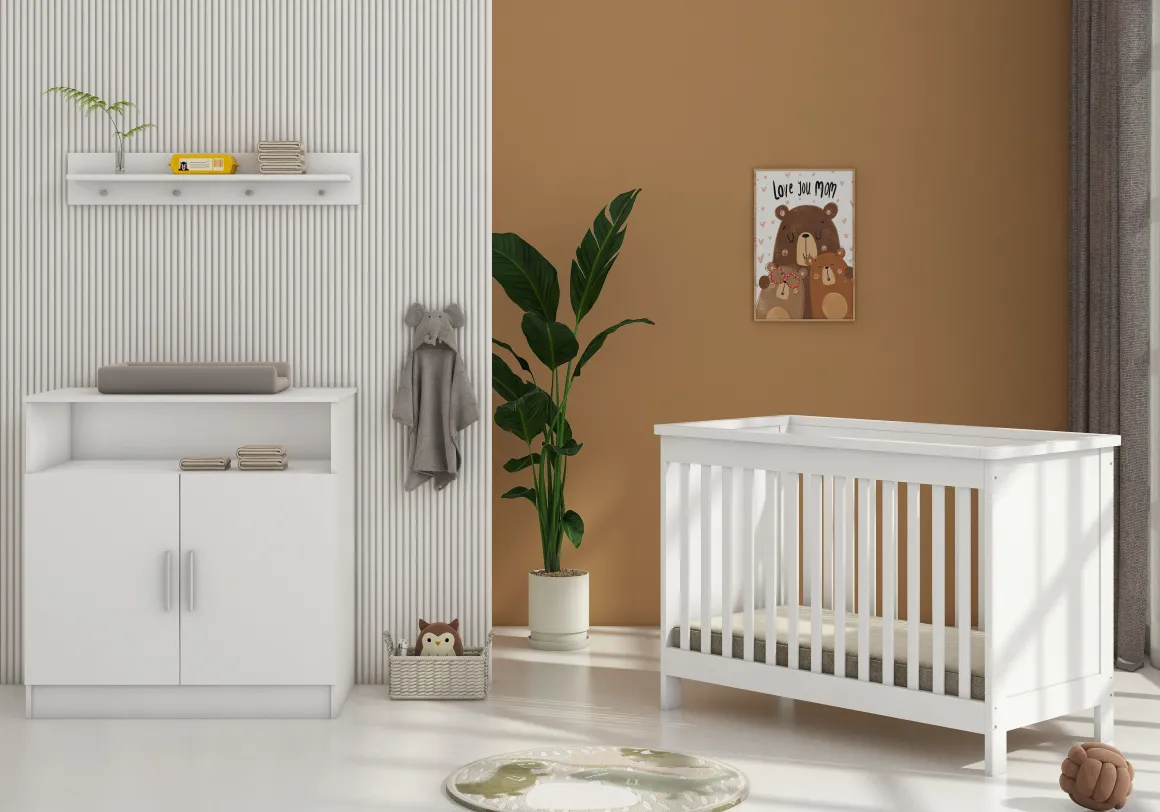 De meubels uit deze prachtige babykamer zijn gemaakt van wit gelakte meubelplaten, welke afgewerkt zijn met deco fineer.