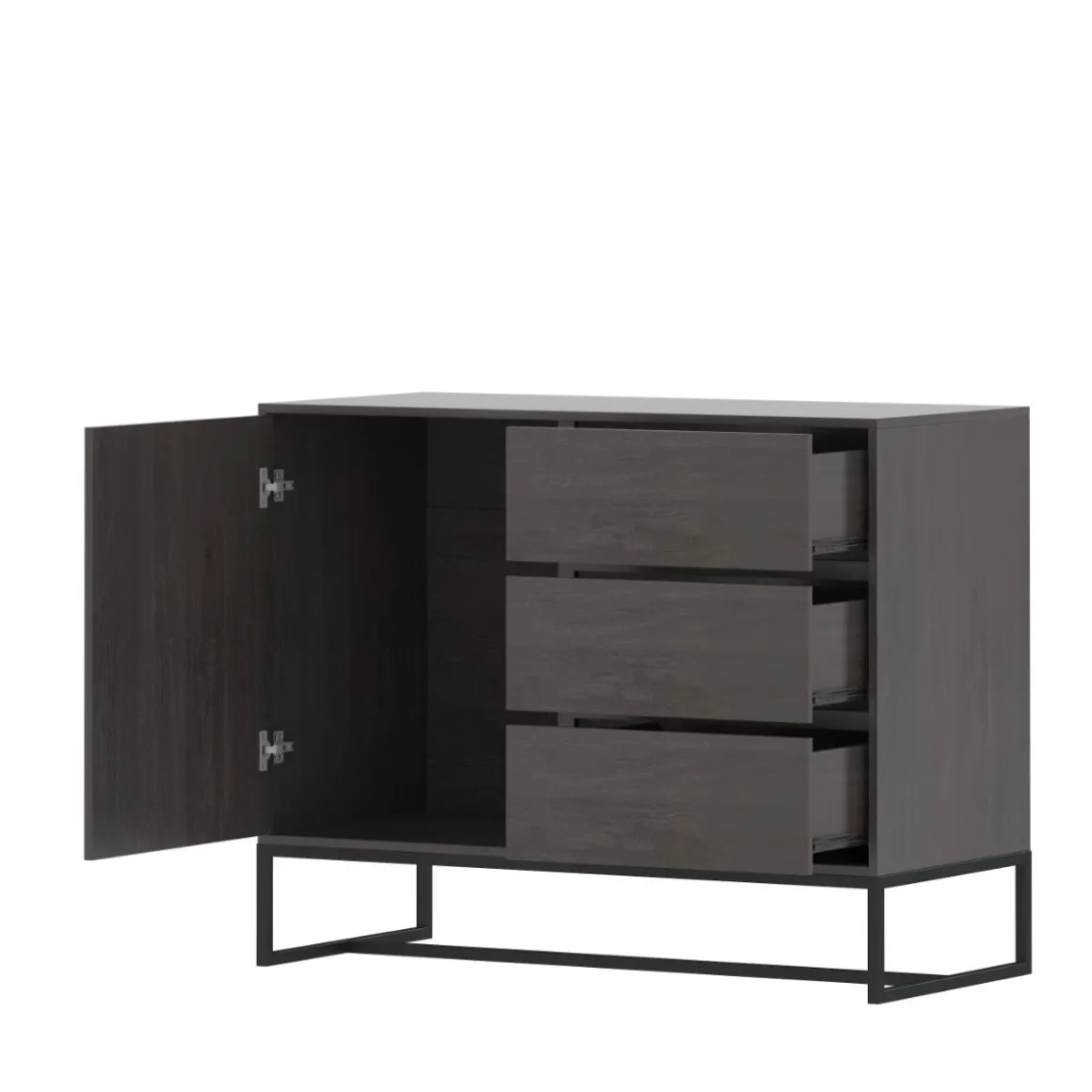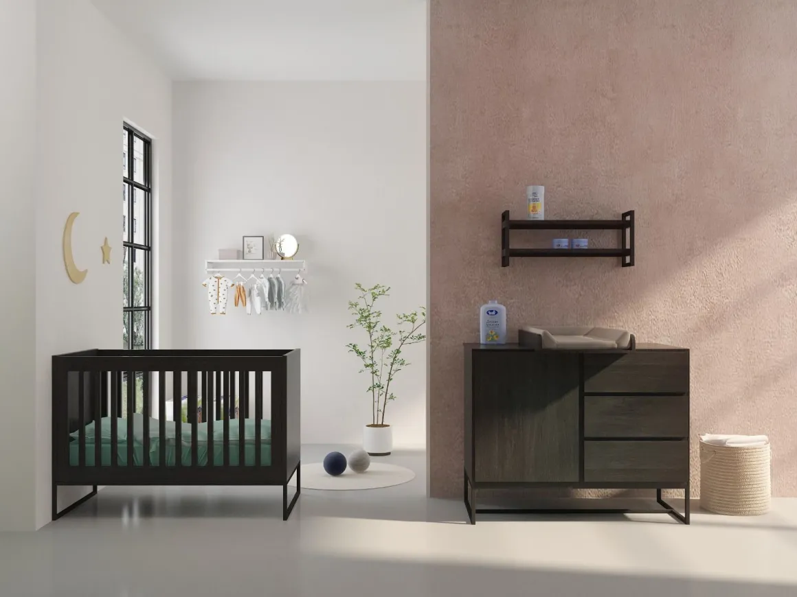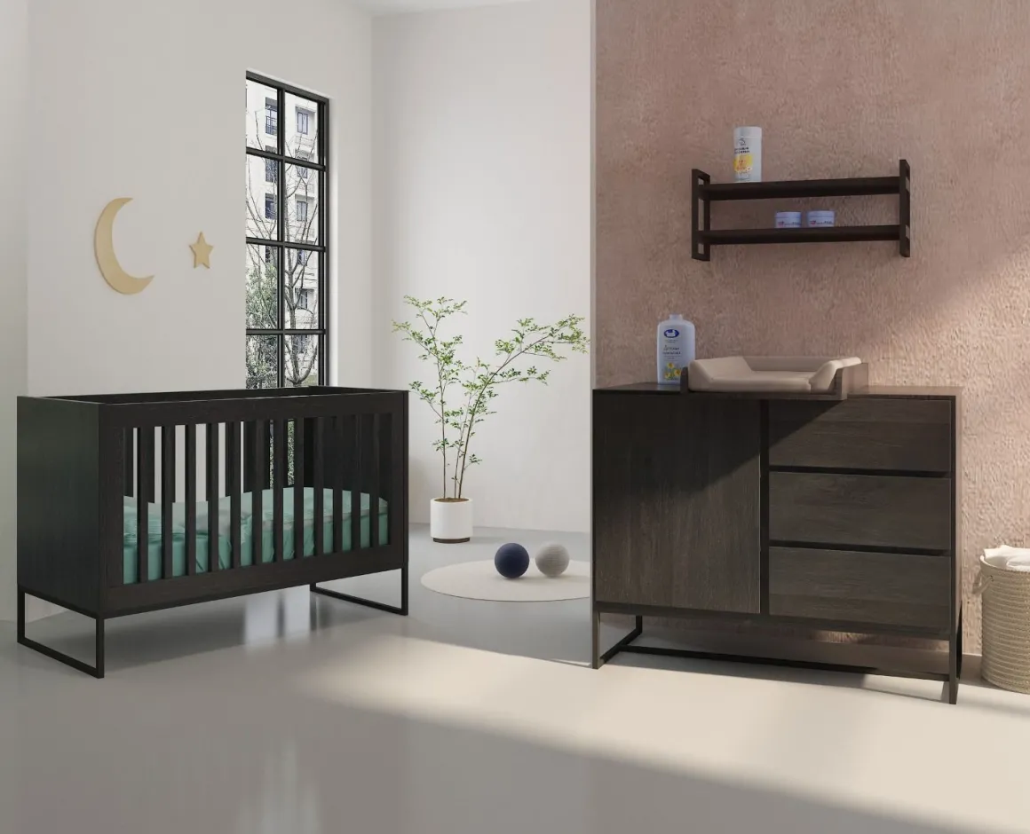 Met Born Lucky Babykamer Toscane creëer je een eigentijdse en trendy slaapomgeving voor je kindje. De meubels hebben een donkere grijze kleur met een zichtbare houtnerf. De zwarte metalen pootjes geven de meubels een stoer detail. De greeploze lades en kastdeuren zorgen voor een strak en stijlvol design.