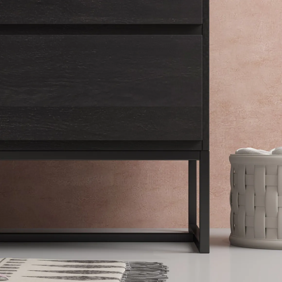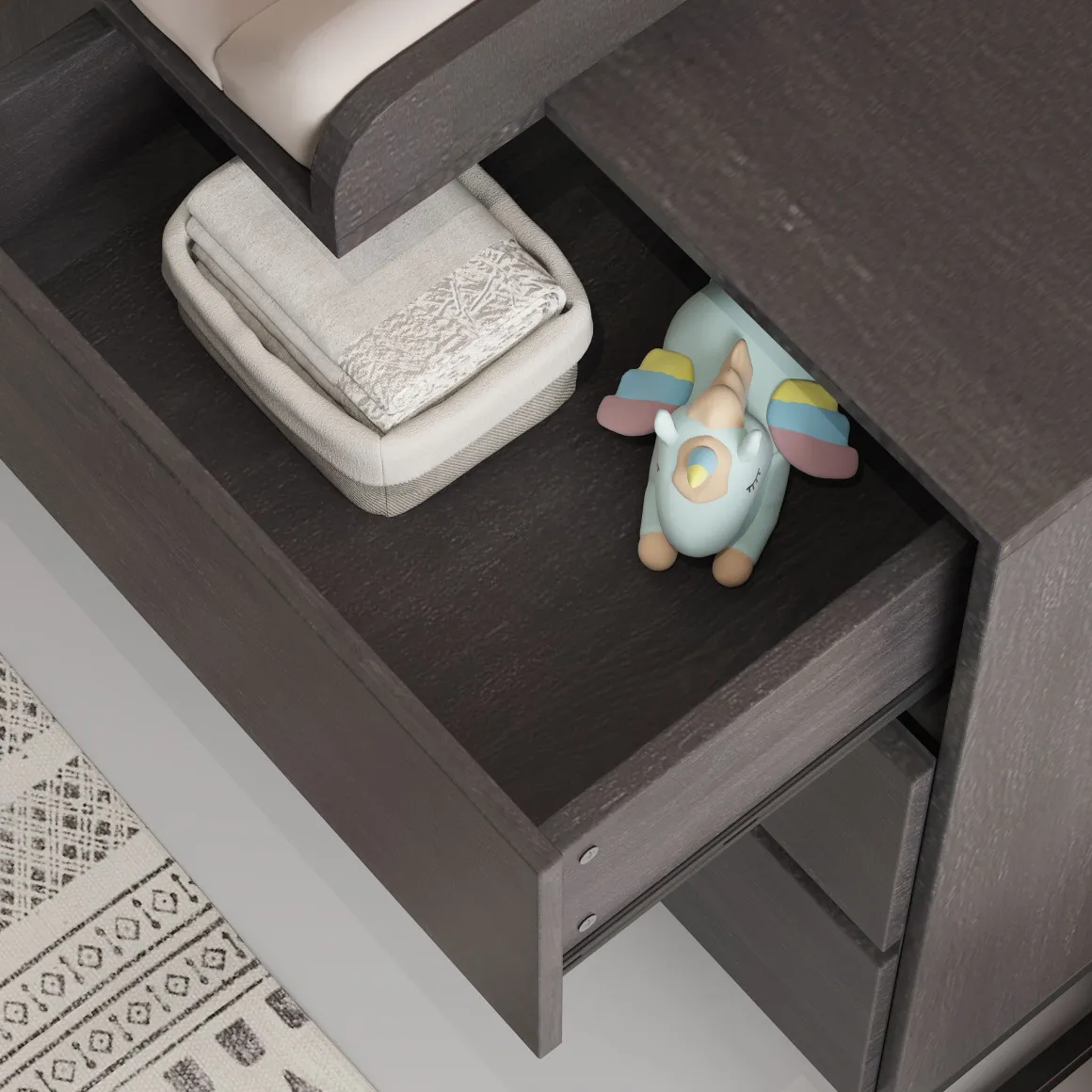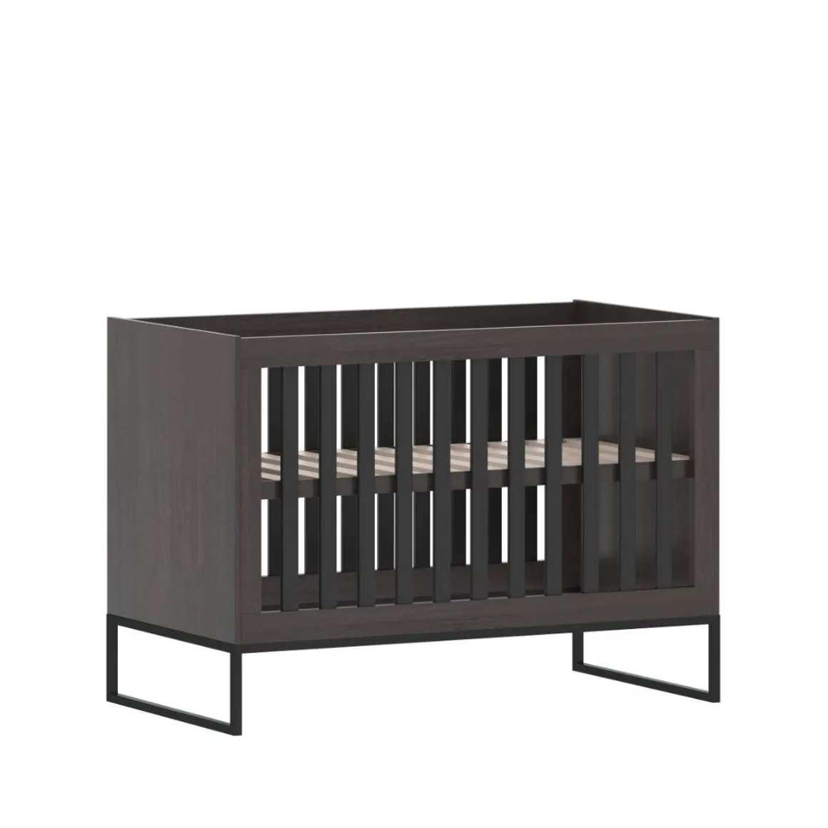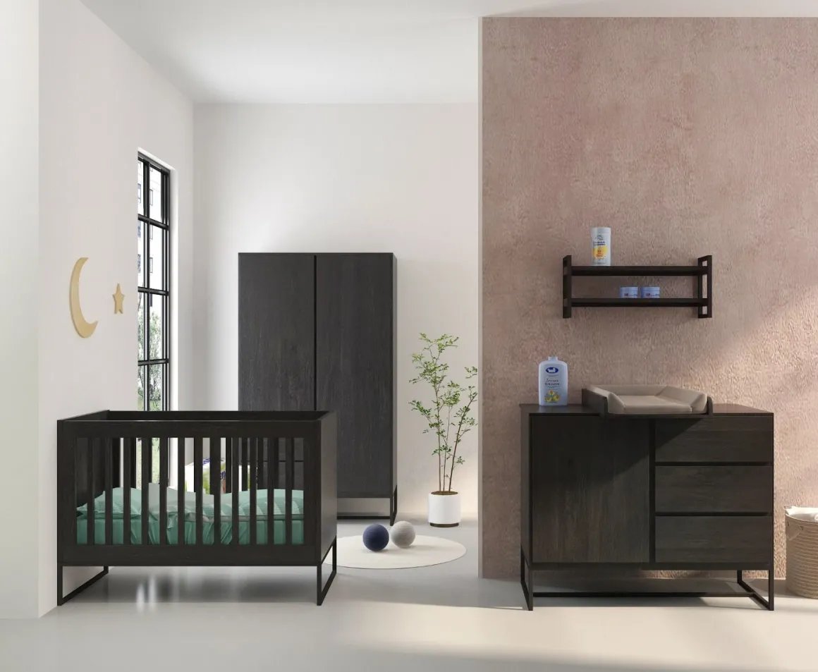 Met Born Lucky Babykamer Toscane creëer je een eigentijdse en trendy slaapomgeving voor je kindje. De meubels hebben een donkere grijze kleur met een zichtbare houtnerf. De zwarte metalen pootjes geven de meubels een stoer detail. De greeploze lades en kastdeuren zorgen voor een strak en stijlvol design.