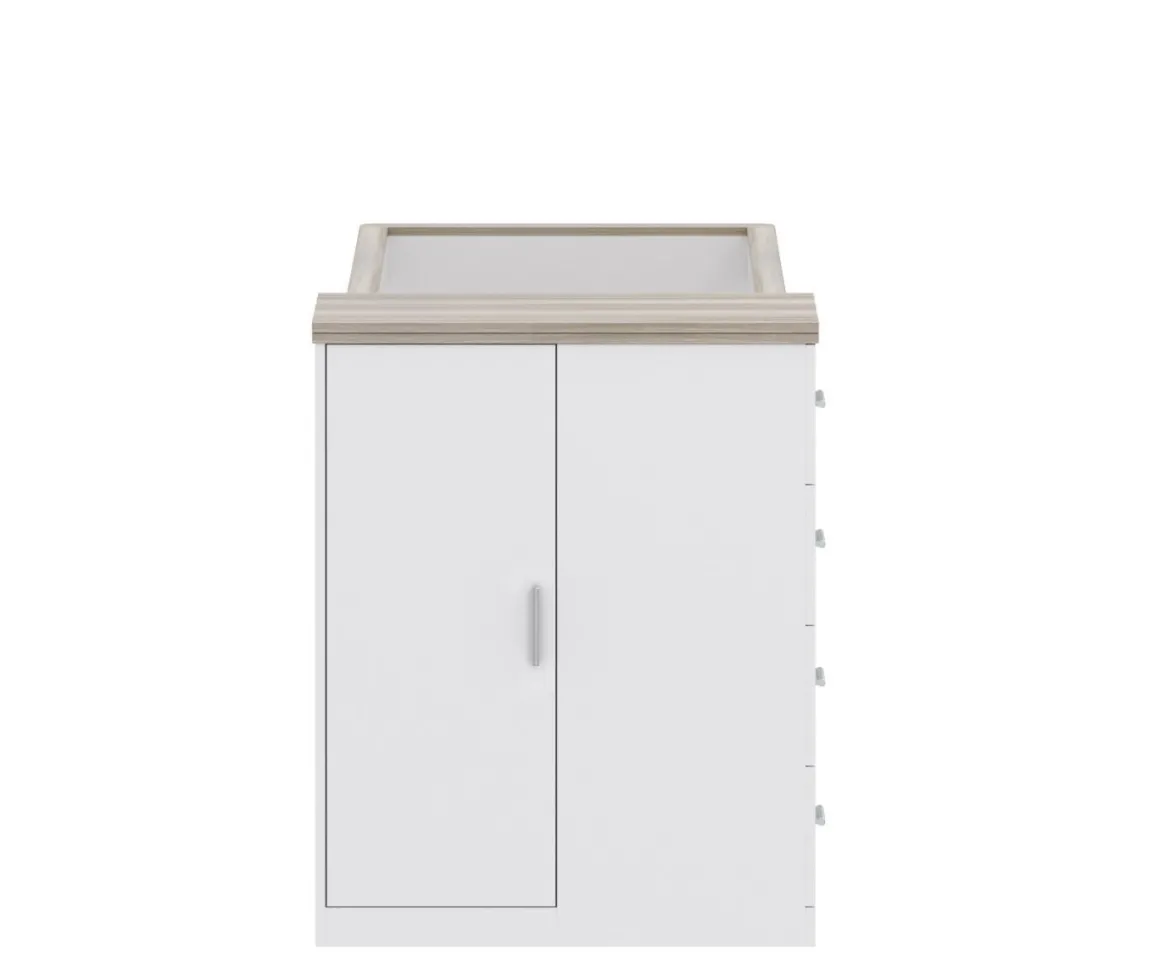 Op het uitklapbare commodeblad op het kastje heb je voldoende ruimte voor het verschonen, verzorgen en aankleden van het kindje.